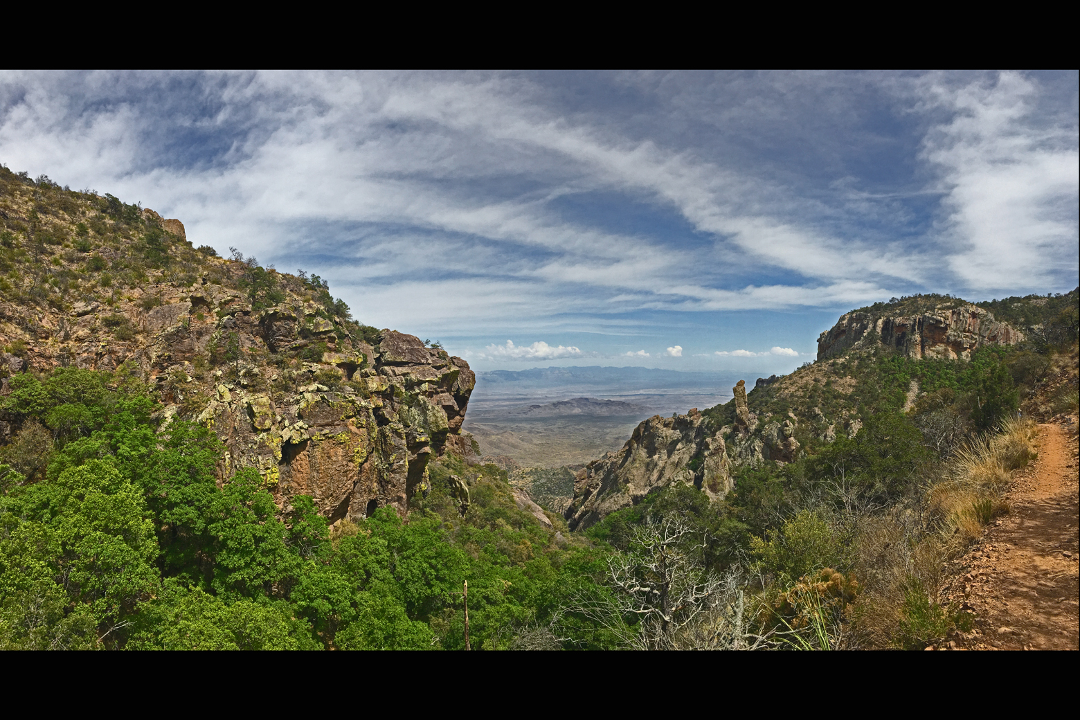 Smack in the middle of the park is an isolated cluster of mountains called the Chisos Mountains. The Chisos are high enough – Emory Peak is the highest peak at 7,832 feet – that trees such as Arizona pine, Douglas fir, quaking aspen, and bigtooth maple occur here. This is quite surprising considering the miles and miles of hot desert scrub surrounding these mountains.