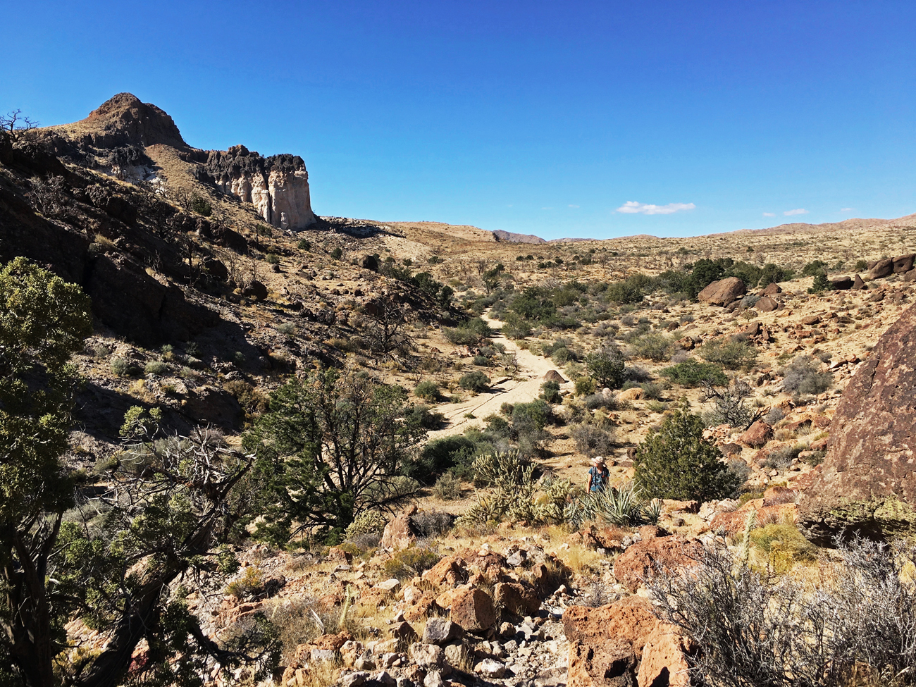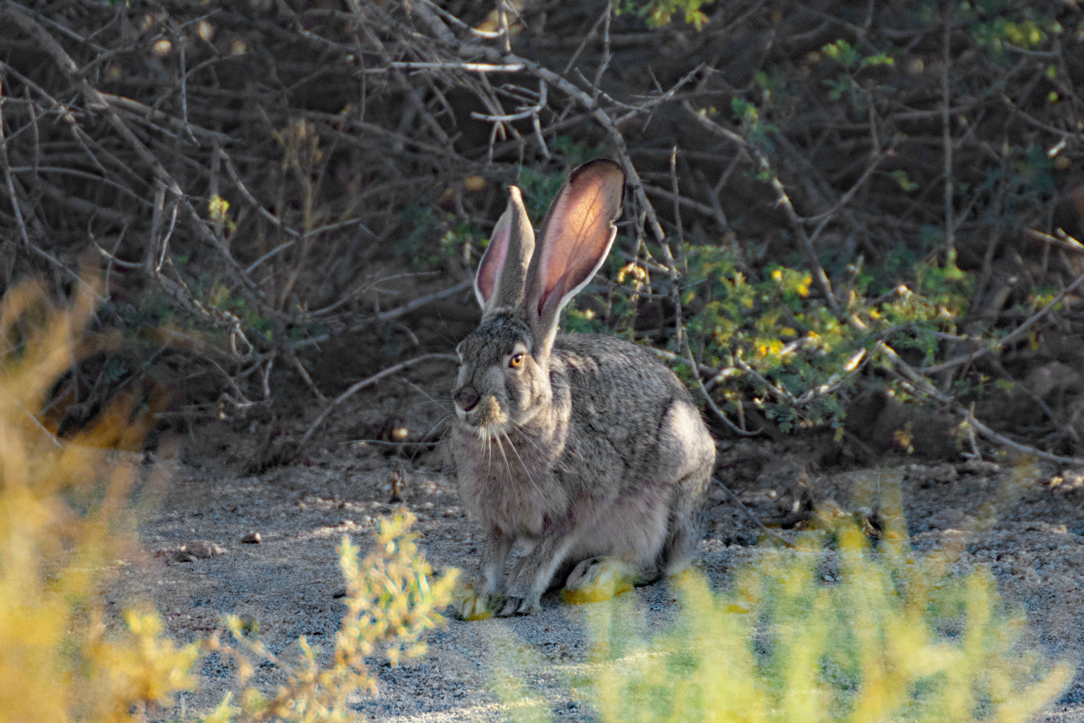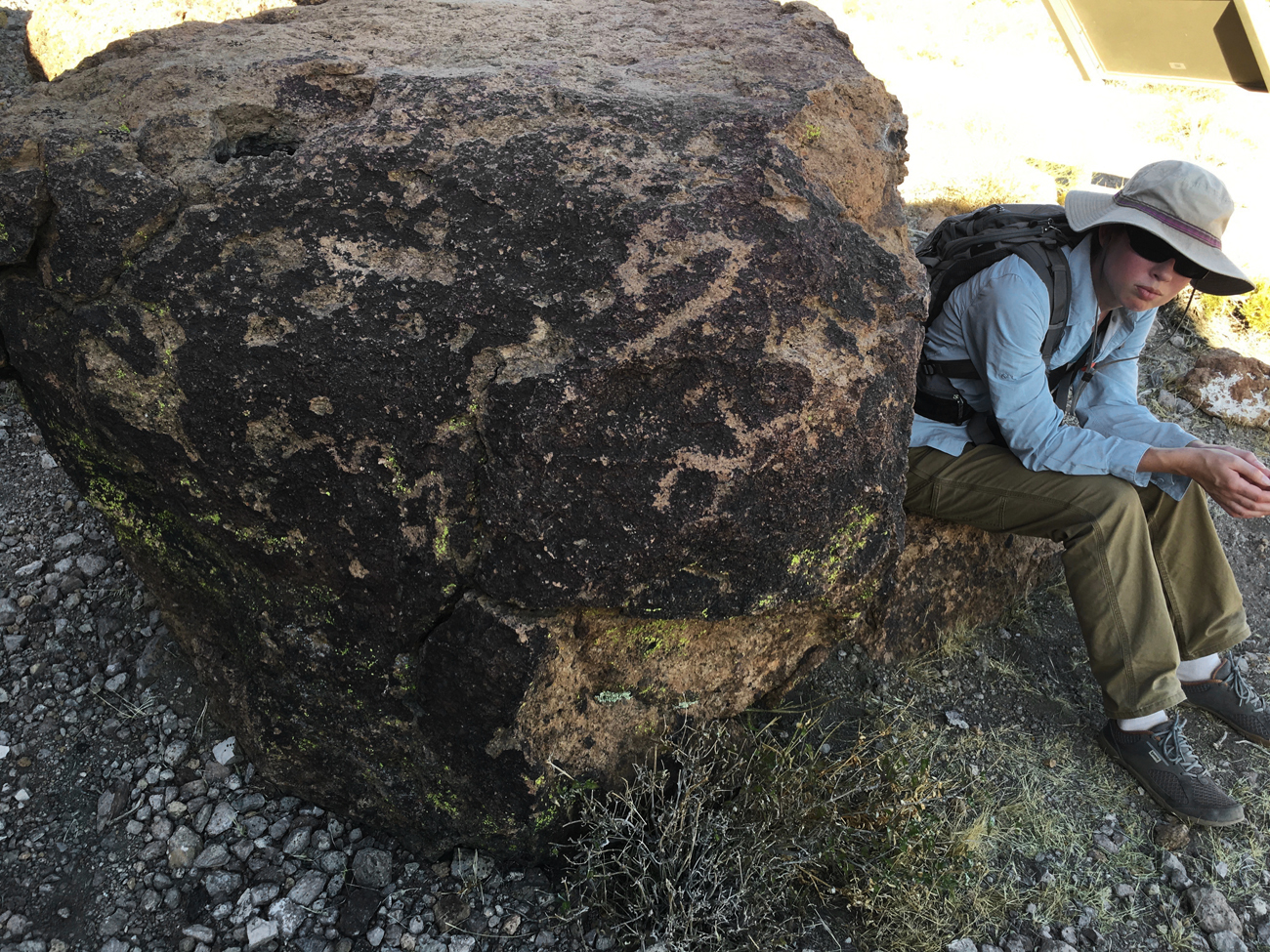 On Saturday we hiked the Barber Peak Loop Trail from the campground – 7.22 miles and 912 feet of total ascent. We hiked around rock formations and desert scrub and through cactus “gardens.” Cholla spines got stuck in the bottoms of our shoes – impossible to avoid on this trail. Cottontails scared us as they leapt out from under shrubs one to two feet away from us! We saw black-throated sparrows, white-crowned sparrows, a golden eagle, crissal thrashers, cactus wrens, chipping and Brewer’s sparrows, and a ladder-backed woodpecker. There were petroglyphs at the end of the trail as we returned to the visitor center. Overall, it was a great desert hike, though seven miles was probably a bit much for my feet that day.
