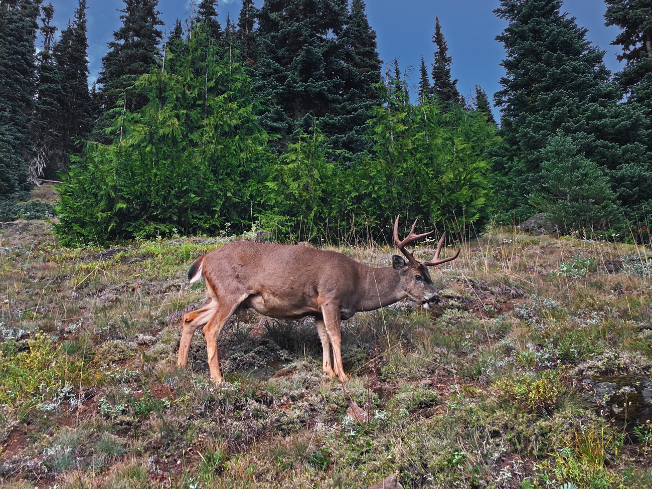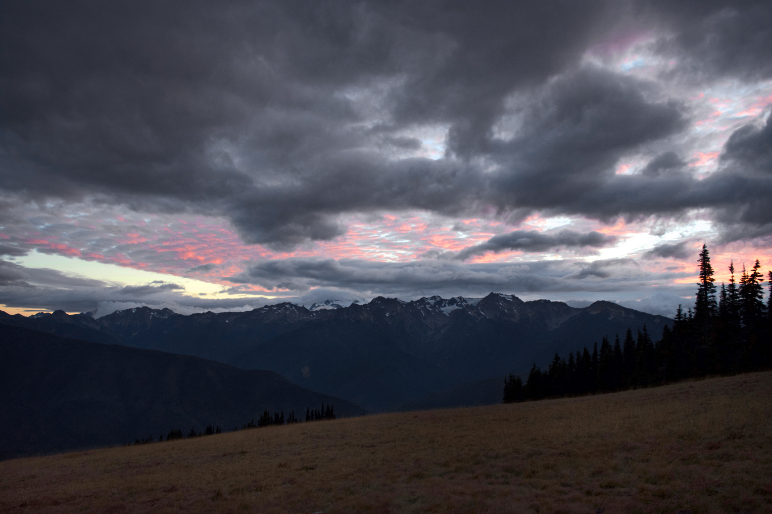 It was a challenging hike for both of us, considering we are not in the best of health, but we put one foot in front of the other and kept a focus on the present moment and enjoyed every bit of it. We rested halfway up the switchbacks to Klahhane Ridge and watched as a male black-tailed deer foraged on the slope directly above us. As soon as we reached Klahhane Ridge, the wind blasted us in the face. We stood rigid against the wind and took in the impressive views as our hands began to freeze. After a few moments of awe, we took refuge again by hiking back down the southern slope into the warm sun and out of the wind. On our return trip, we ran across a chatty group of gray jays and watched a glorious pink sunset from the ridge top as clouds began to roll in. Near the end of the trail in the twilight, we spooked a snowshoe hare still in his brown summer coat, and he flashed out of sight and down the hill. The winds picked up, and the chill settled in as we slowly pushed our achy legs and feet to carry us to the finish line and the warmth and protection of our truck.