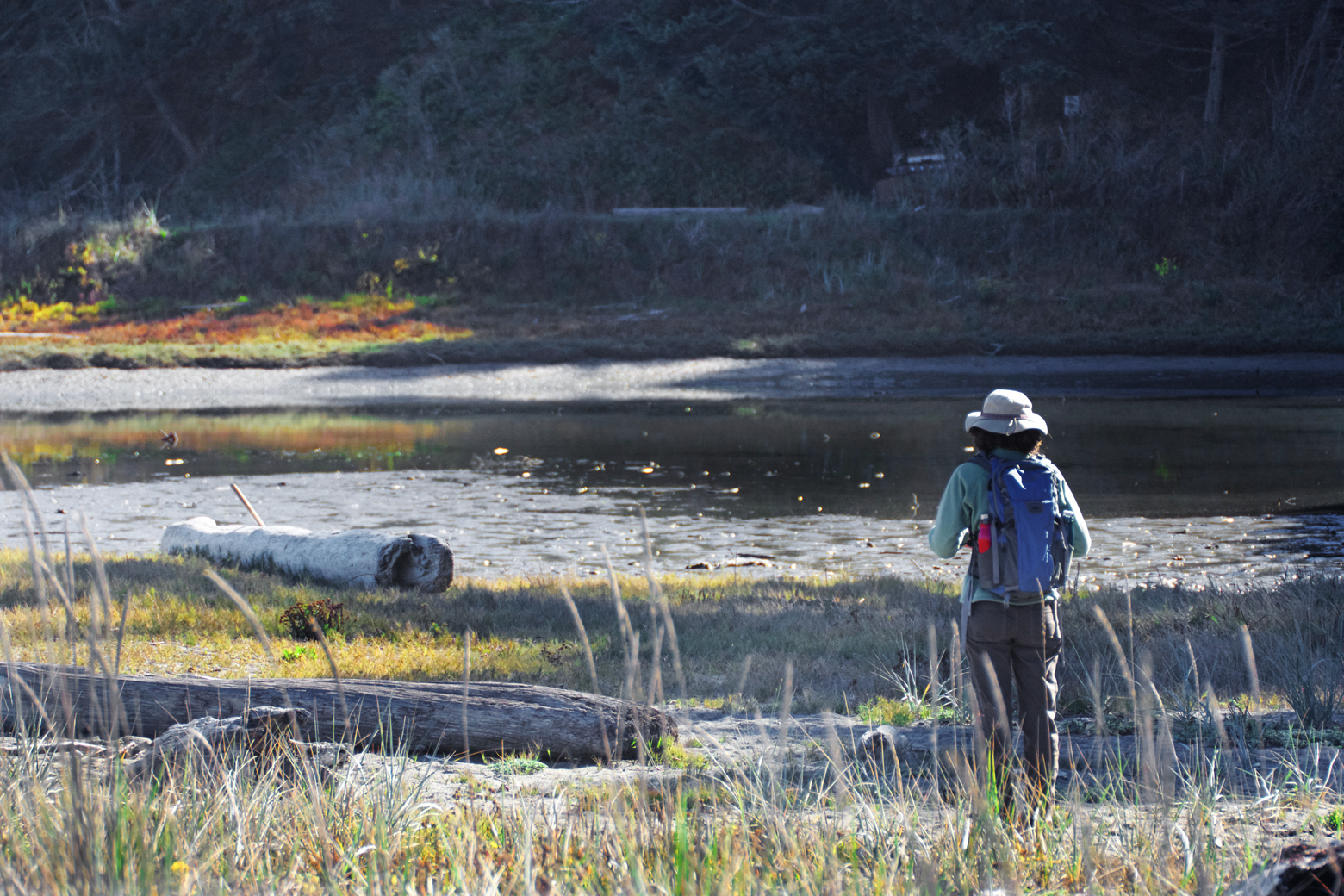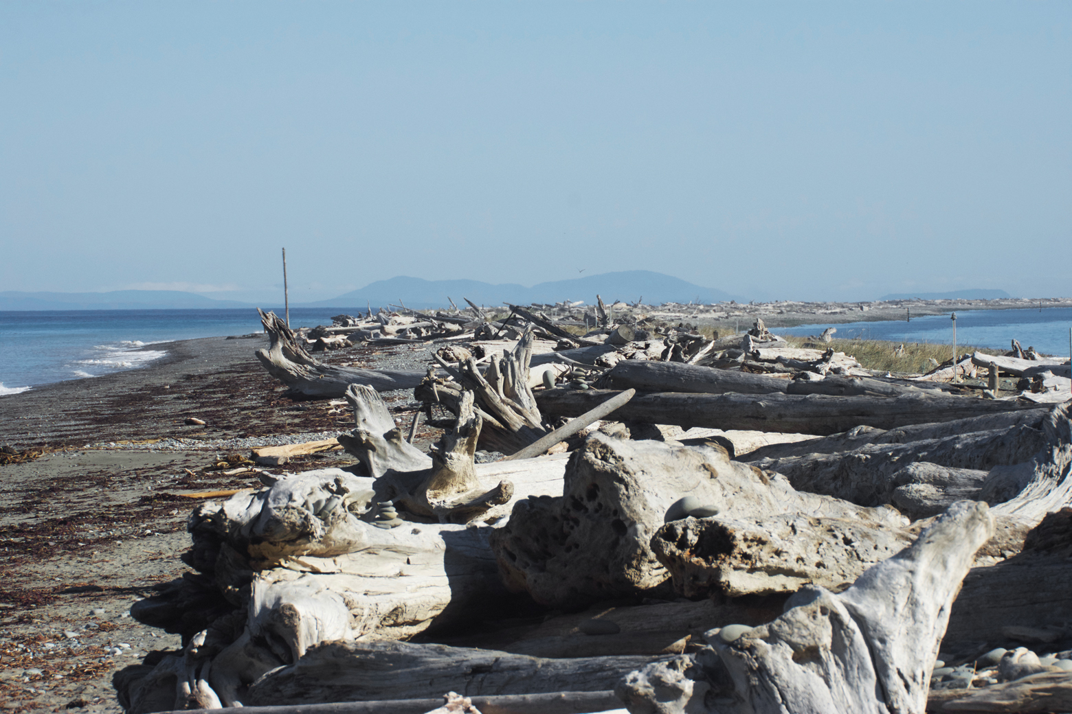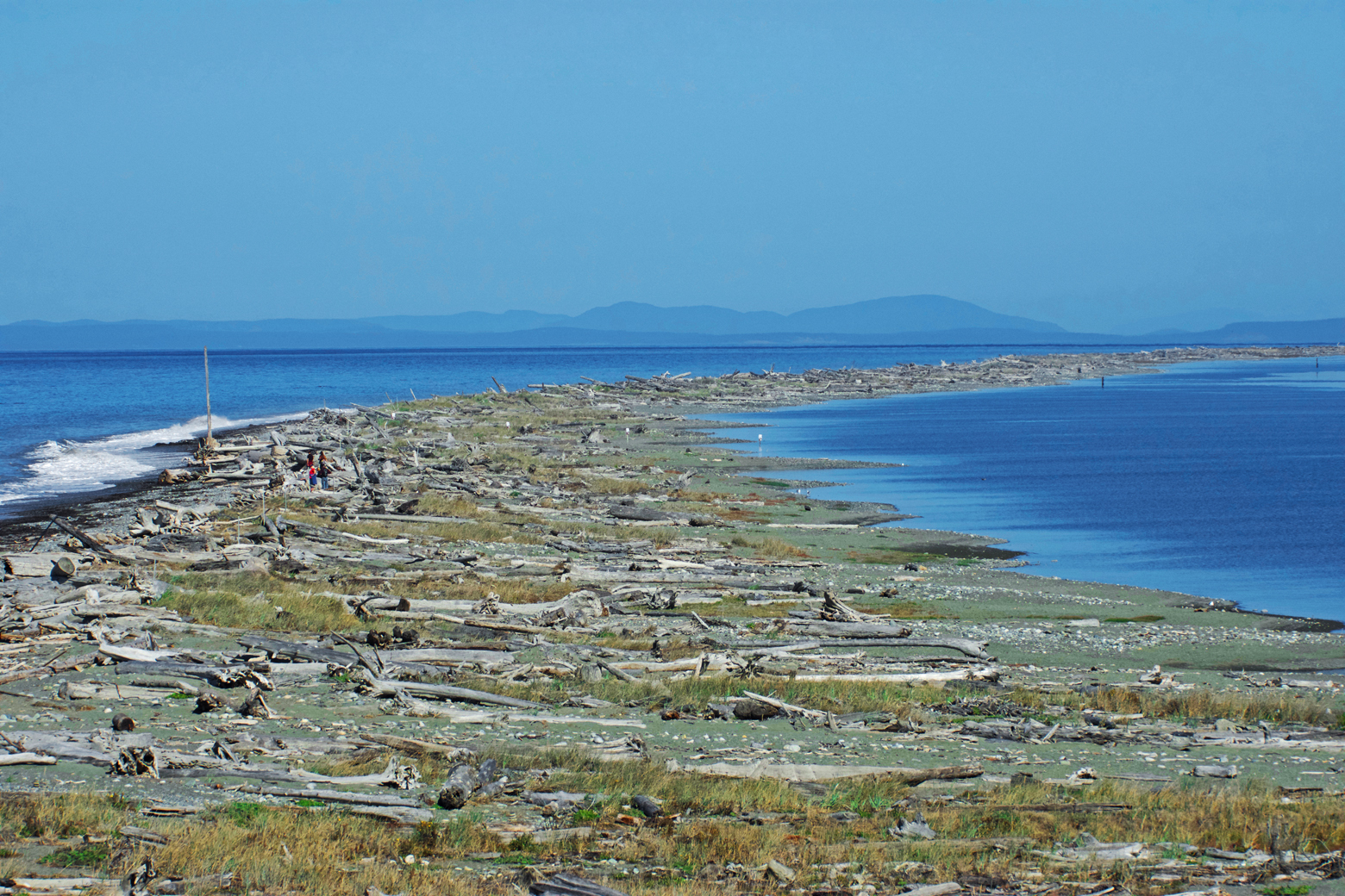 One of the world’s longest natural sand spits, Dungeness National Wildlife Refuge juts out into the Strait of Juan de Fuca from the coast of Sequim (pronounced skwim). This five-mile-long spit creates a calm bay behind it along with extensive tidal mudflats and rocky and sandy habitats important to resting and foraging migrating shorebirds. Although some people enjoy the challenge of walking five miles in the sand to the lighthouse at the end of the spit, we were there for the birds. Hiking the spit is best at or near low tide, because high tide will push hikers up onto the large driftwood that has collected on the sand, which can be difficult to navigate and can be dangerous if the tide reaches it.