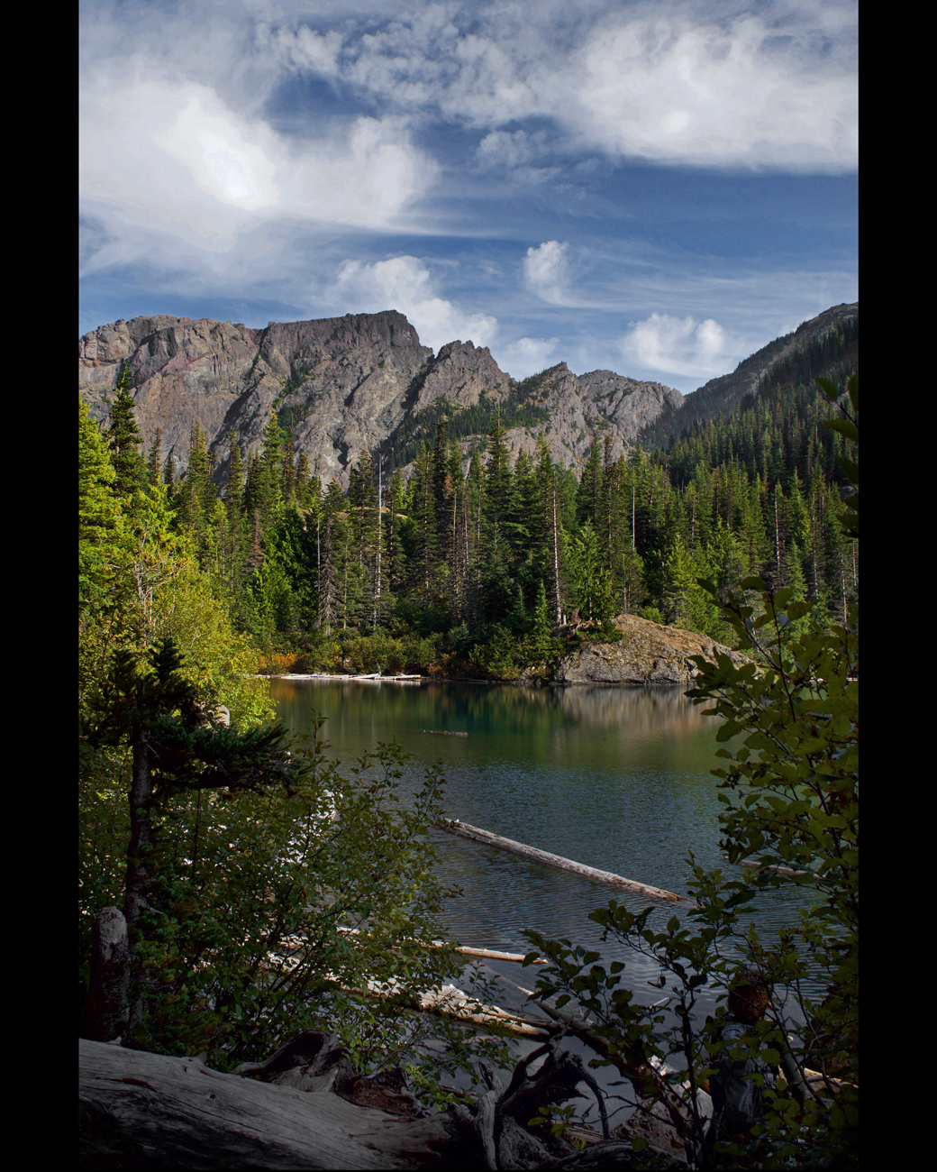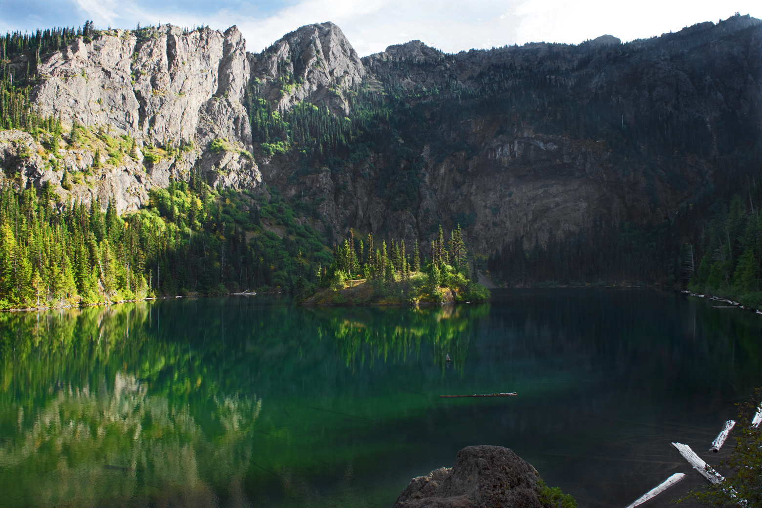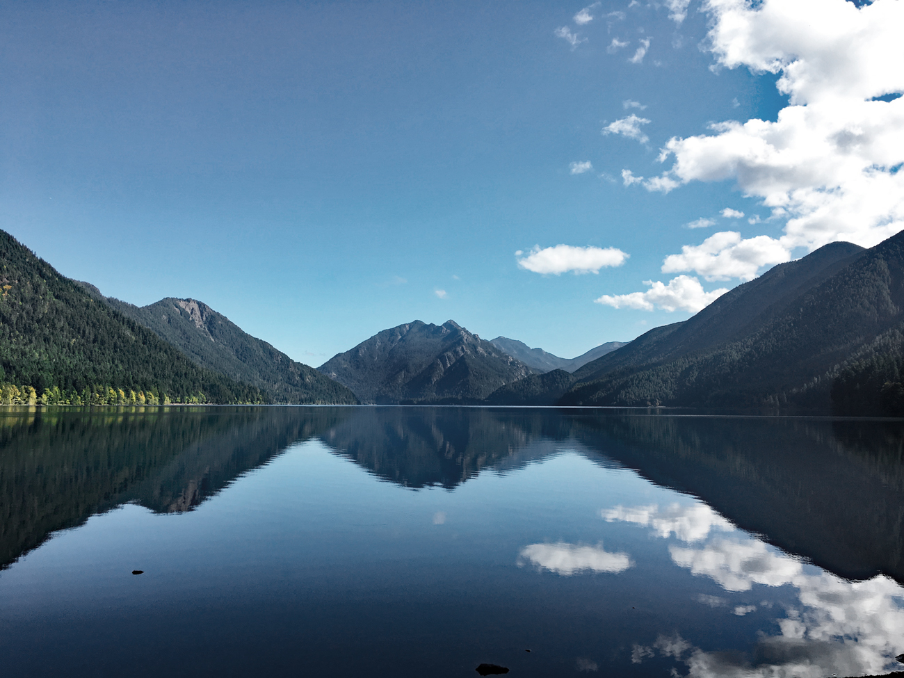 The scenery finally changed when we emerged from the dark switchbacks and reached the top of the mountain. Here there were patches of sunlight and all sorts of colorful vegetation again. We followed the trail to the left, and there it was, deep blue and green Lake Angeles, surrounded by steep mountain slopes on three sides with a forested island in the middle. Just another breathtaking view on the Olympic Peninsula!