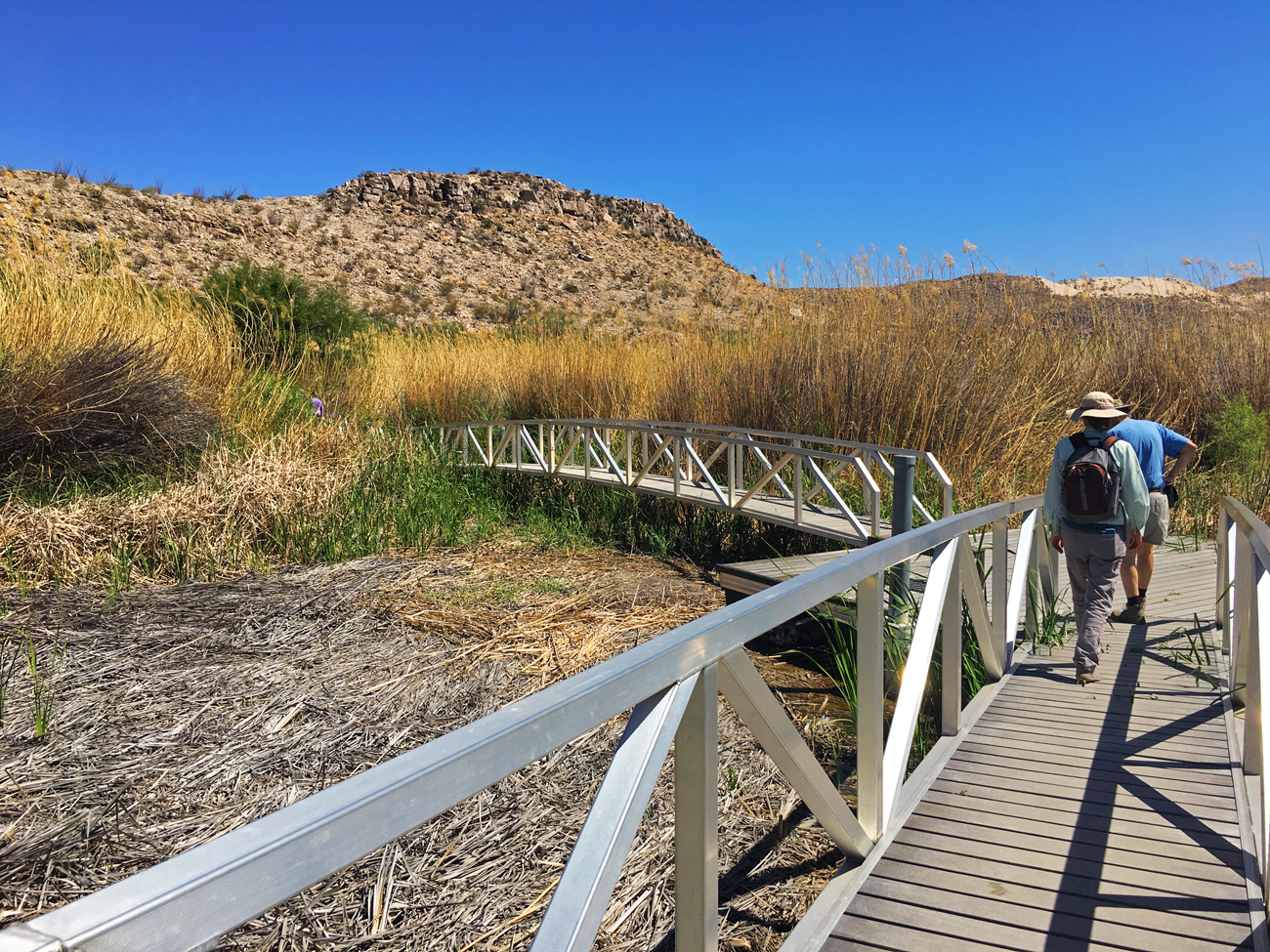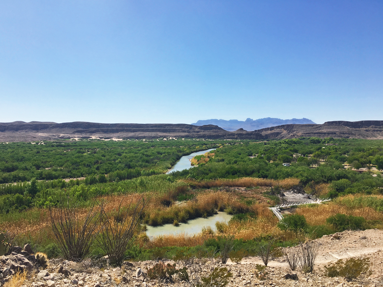 The nature trail at Rio Grande Village provides access to the river and its riparian habitats, and a short hike up a hill offers sweeping views of the Rio Grande. From here, you can also enjoy a wall-free view of our neighbors over in Mexico. In this part of the World, the landscape is mostly undeveloped, except for a small town in Mexico called Boquillas del Carmen. The nature trail crosses some marshy areas on boardwalks and then splits. From here, you can take a couple of switchbacks up a hill for the overlook, or you can continue onto the sandy river peninsula and take a dip in the Rio Grande. Both are short trips, and it is worthwhile to do both.