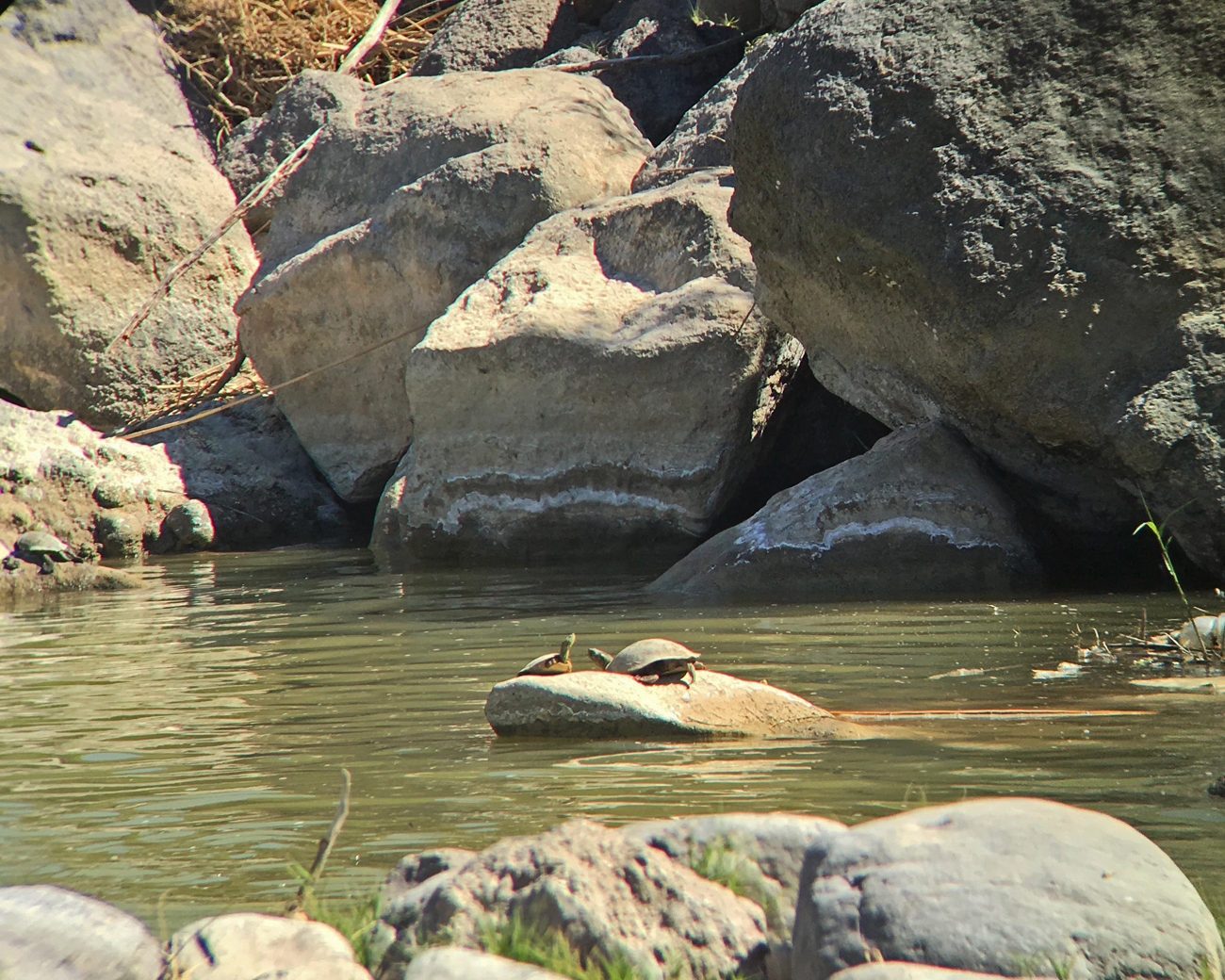 The cooler air and beautiful views put us all in a good mood as we entered the canyon. The moment reached perfection when the bouncing song of a canyon wren echoed off the canyon walls, and we decided to plop down on a boulder and stay a little while. To top it off, on our way back we glanced down and caught a glimpse of a water snake swimming in the river.