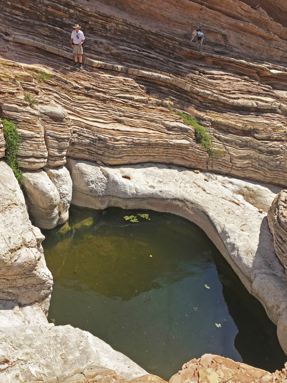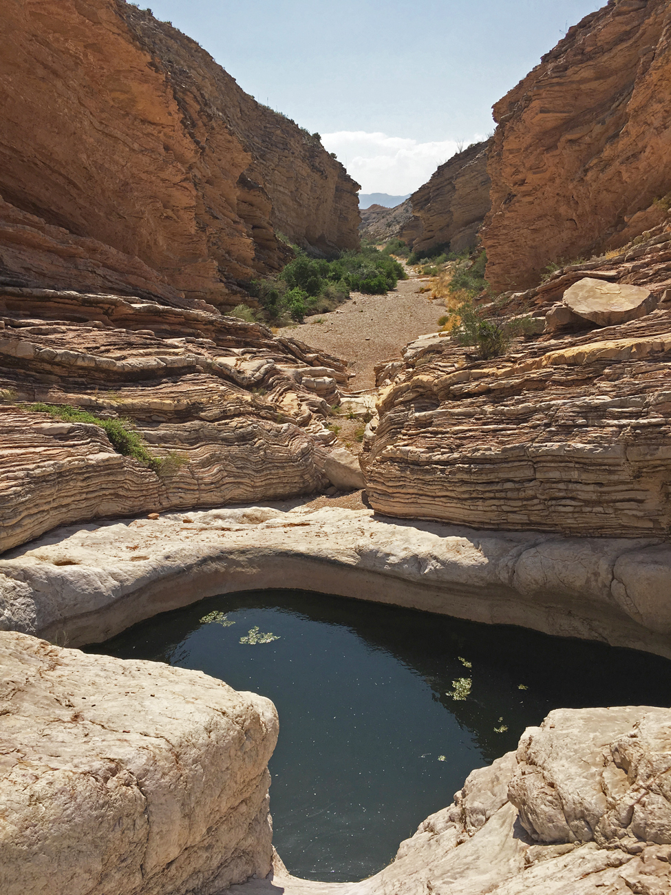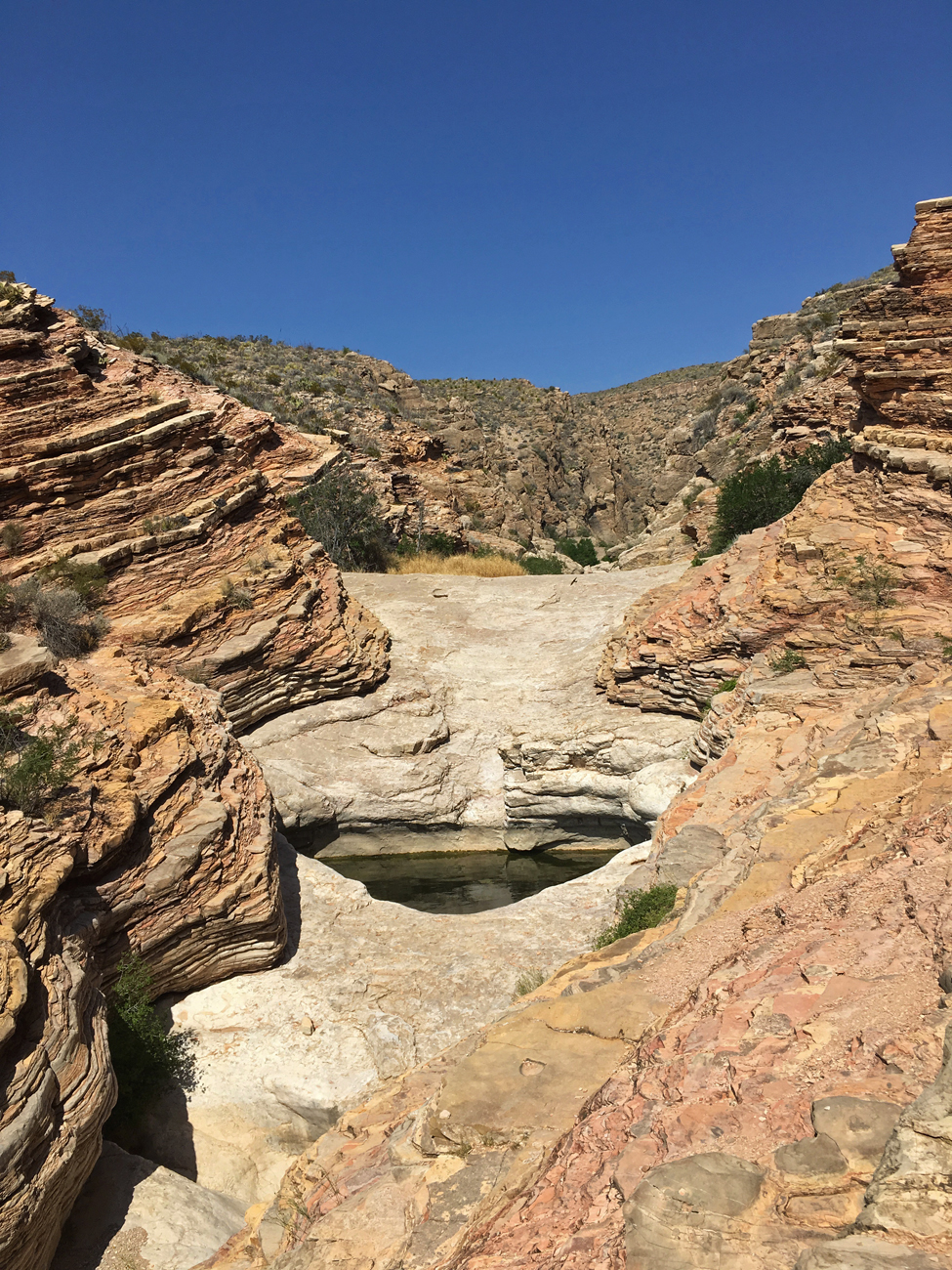 After reaching the parking area, the trail to Ernst Tinaja immediately enters an impressive canyon. The sedimentary layers that form the canyon walls look like stacks of paper, neatly upright in some areas and folded in others. The trail substrate alternates between sand and polished bedrock. Along the way, we got some good looks at greater earless lizards and an ash-throated flycatcher. Further upstream and deeper into the canyon, the walls begin to close in. Eventually some climbing on the canyon’s sedimentary steps is required to gain a full view of the Ernst Tinaja in the middle of the streambed. We took a seat in the shade and admired the colorful patterns of rock around us and watched a northern rough-winged swallow taking sips from the tinaja as he flew back and forth across its surface.