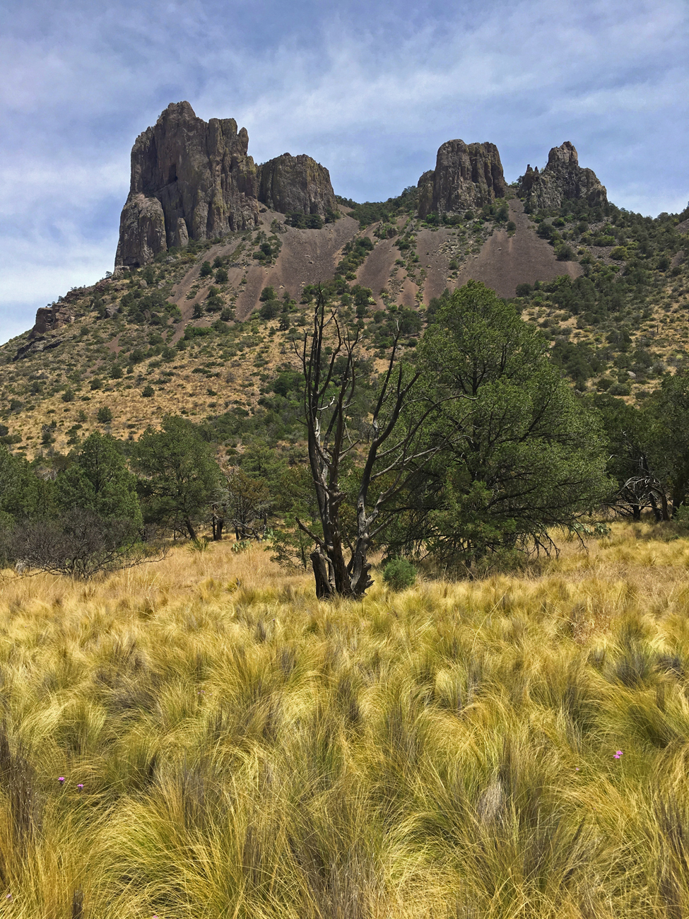 April 12th was a cooler day up in the mountains with the threat of thunderstorms in the afternoon. We climbed through the oaks and junipers and up the switchbacks of the Pinnacles Trail into stands of bigtooth maples, pines and Douglas firs. Blooming wildflowers and cacti were plentiful along the trail, and the views of the Chisos Basin were spectacular. Slow and steady, we continued to climb as I pushed beyond my physical limitations with the mental goal of seeing my first Colima warbler. Just a little bit further and we’ll finally see one!