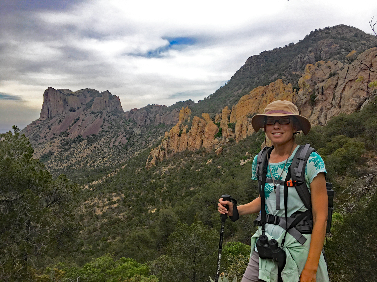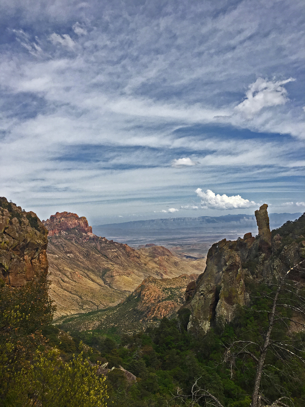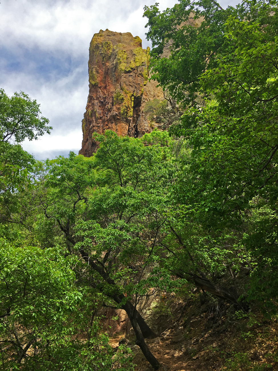 We made it partially into Boot Canyon, taking in the sight of the rock formation known as the “boot.” We were hiking among the treetops along the upper edge of the canyon, and there were lots of songbirds moving around us. However, not one of them was a Colima warbler. Exhausted and concerned about the stormy clouds moving in, we returned along the same path back down to the Chisos Basin. In total, we hiked 6.75 miles and ascended 1,723 feet, reaching an elevation of 7,052 feet!