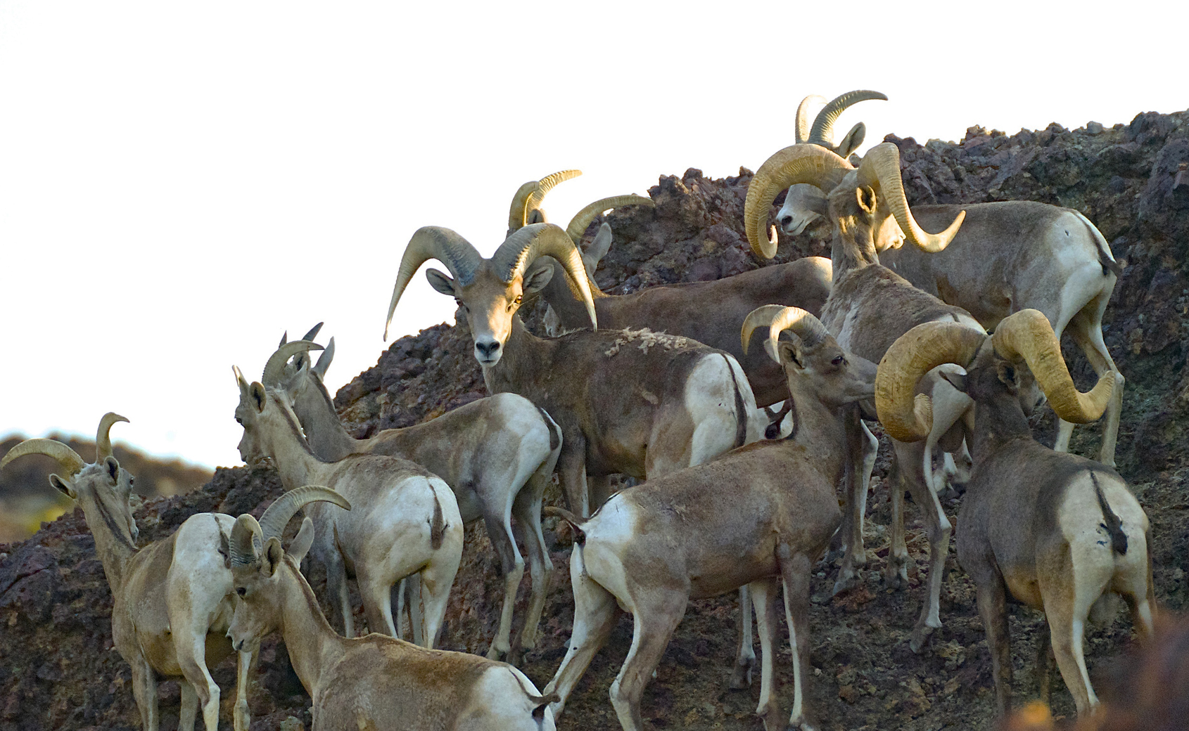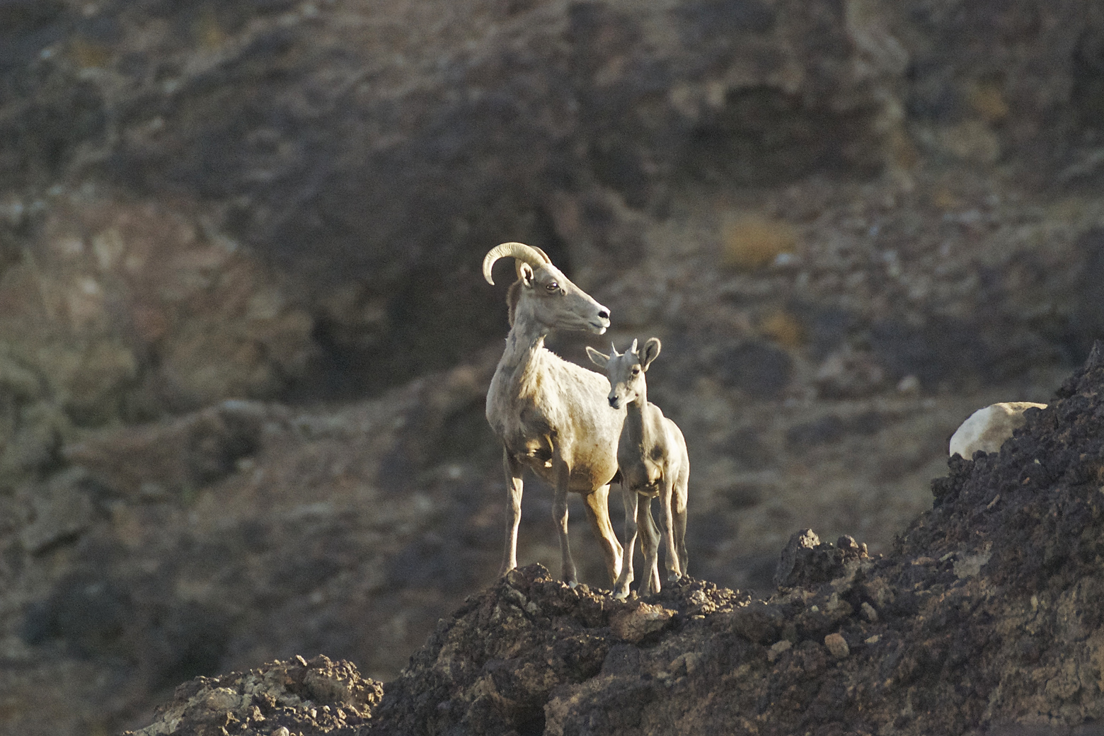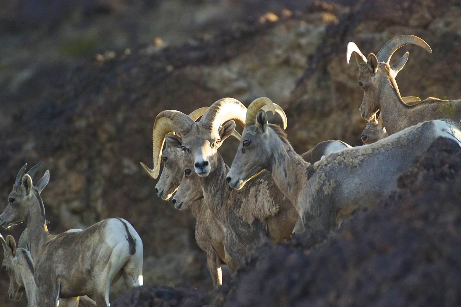 Desert bighorn sheep are elusive animals that live in extremely steep and rocky desert mountains of southwestern North America, and they blend in well with their environment. Populations have declined significantly over the past 100 years, due to competition with wild horses and burros for water and forage and diseases from domestic sheep and cattle. For these reasons, sighting a desert bighorn sheep is a rare and special experience.