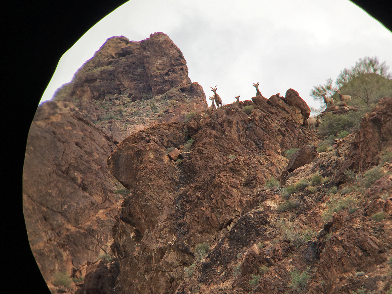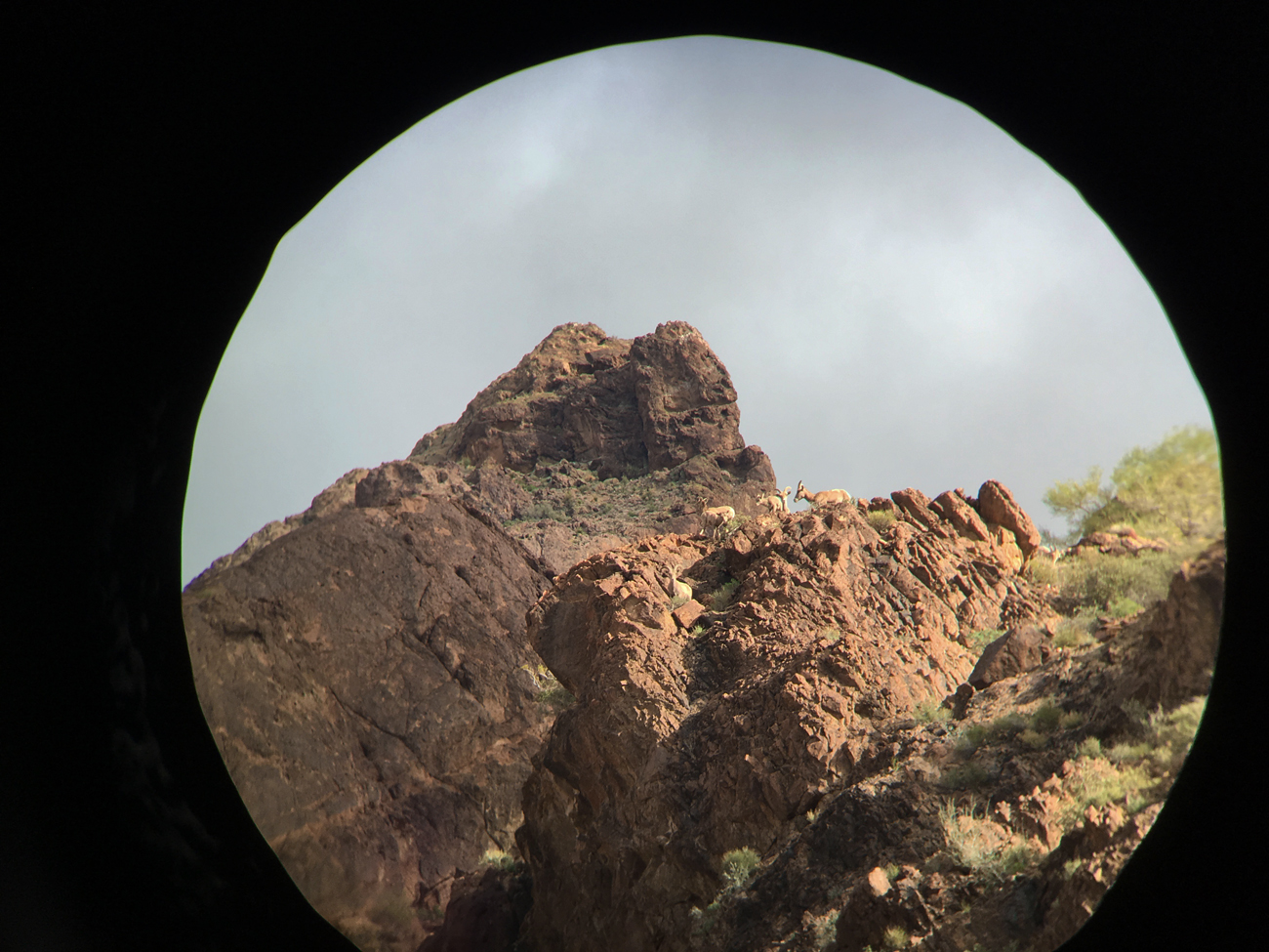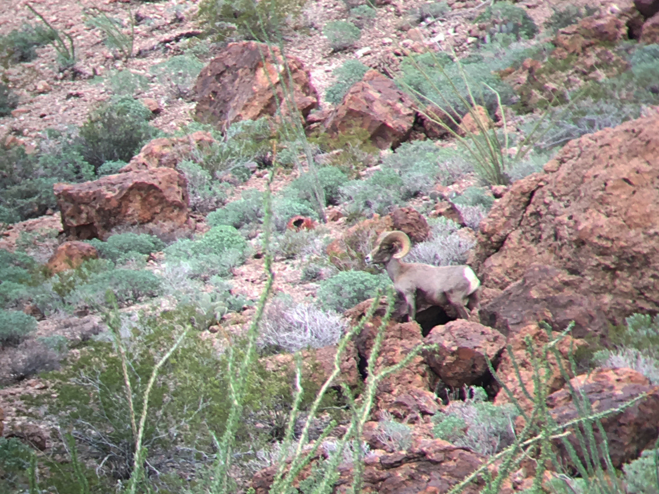 We felt lucky to see these desert mountains the way they should be, with these majestic creatures grazing along the rocky slopes. We couldn’t pull our eyes away. Our arms grew tired from holding up our binoculars! The only downside was that Michael didn’t bring his camera, but maybe if he had, we would not have been so lucky. He did get some photos with his iPhone looking through his binoculars. We kept taking one last look, and then finally we turned and walked our way back along the trail.