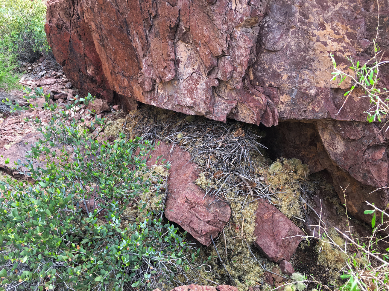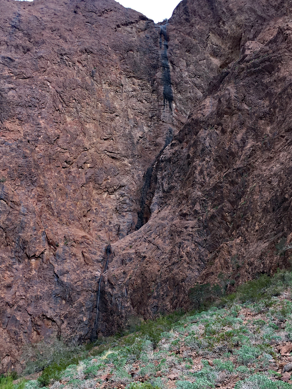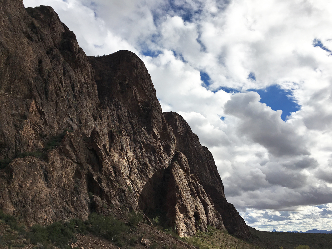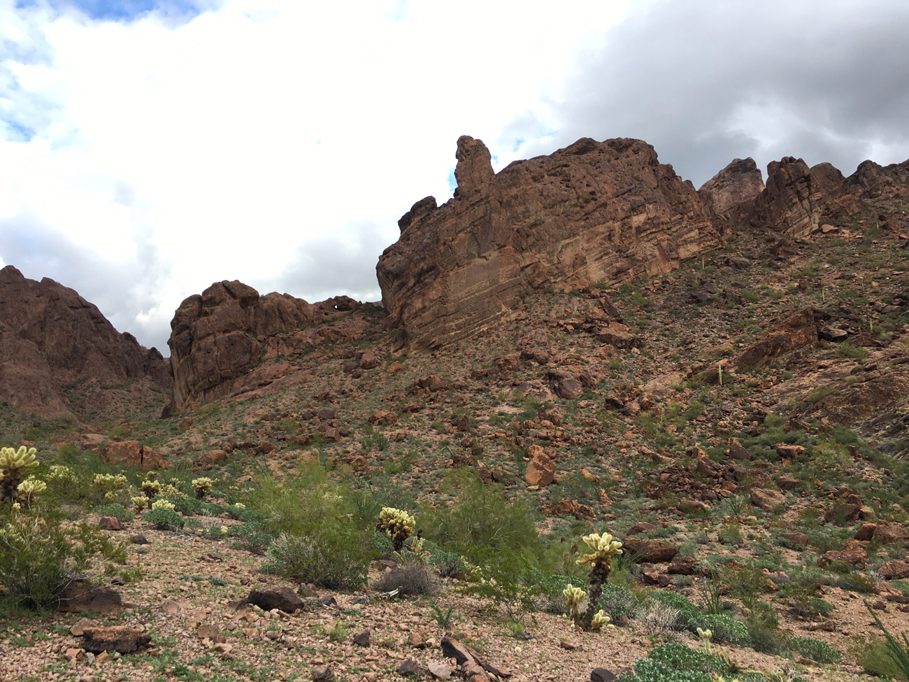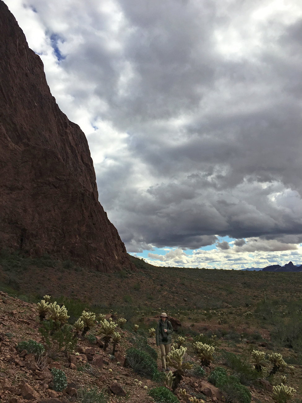 We planned to hike up Palm Canyon, but since we had done that the last time we visited Kofa, we decided to instead take a trail that led us along the perimeter of the mountains. We had to sometimes squeeze past thorny cat’s claw shrubs and carefully step over cholla cactus bits, but the views of the desert and the cliffs next to us were amazing. Since it had rained, there were even a couple of waterfalls on the cliffs. We watched rock wrens bouncing up and down on the rocks and discovered desert woodrat (packrat) dens. We continued to scan the mountaintops just in case there were sheep.