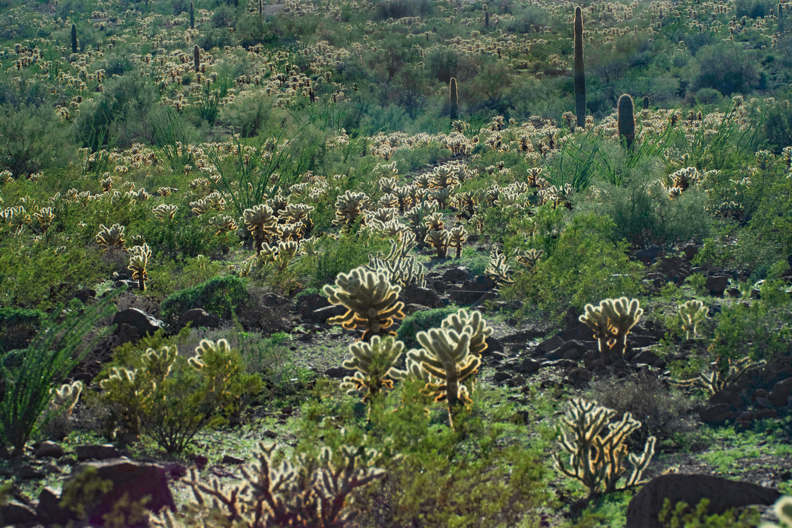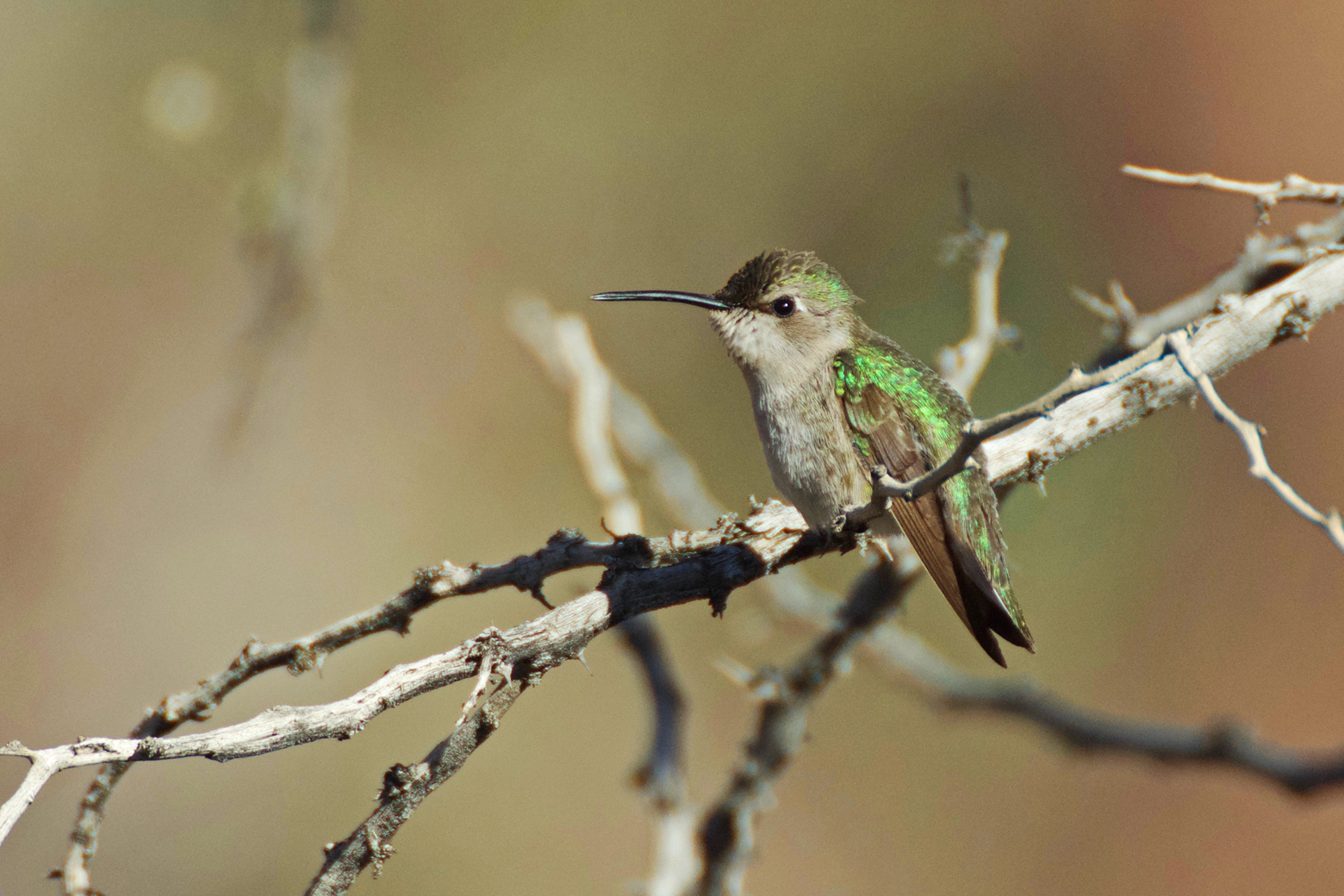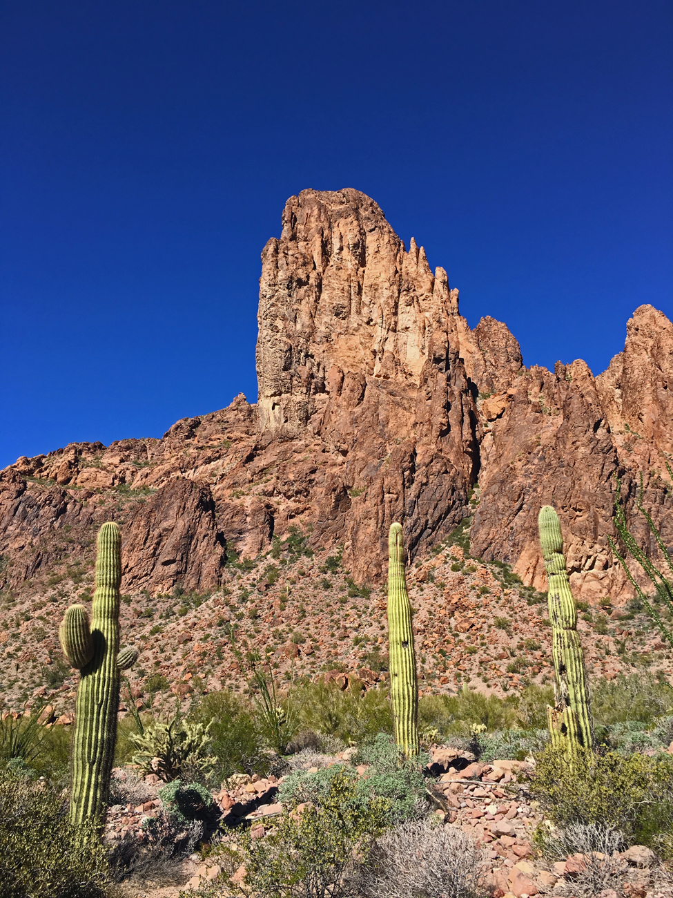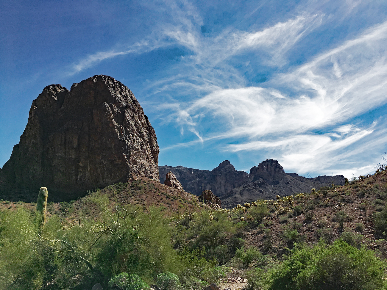 On our first day exploring the refuge, we drove a very slow five miles (it took us about an hour) down Kofa Queen Canyon Road, a narrow dirt road more appropriate for jeeps than our full-sized pickup truck. I had to jump out a few times to hold shrubs back to keep them from scratching the side of the truck. When we arrived at the canyon entrance, we parked and hiked about 2.5 miles into the canyon. The canyon is beautiful with brown jagged peaks and rock formations on either side and the bright green Sonoran desert plant life scattered across the canyon floor. We saw bighorn sheep tracks and scat, but no sheep.