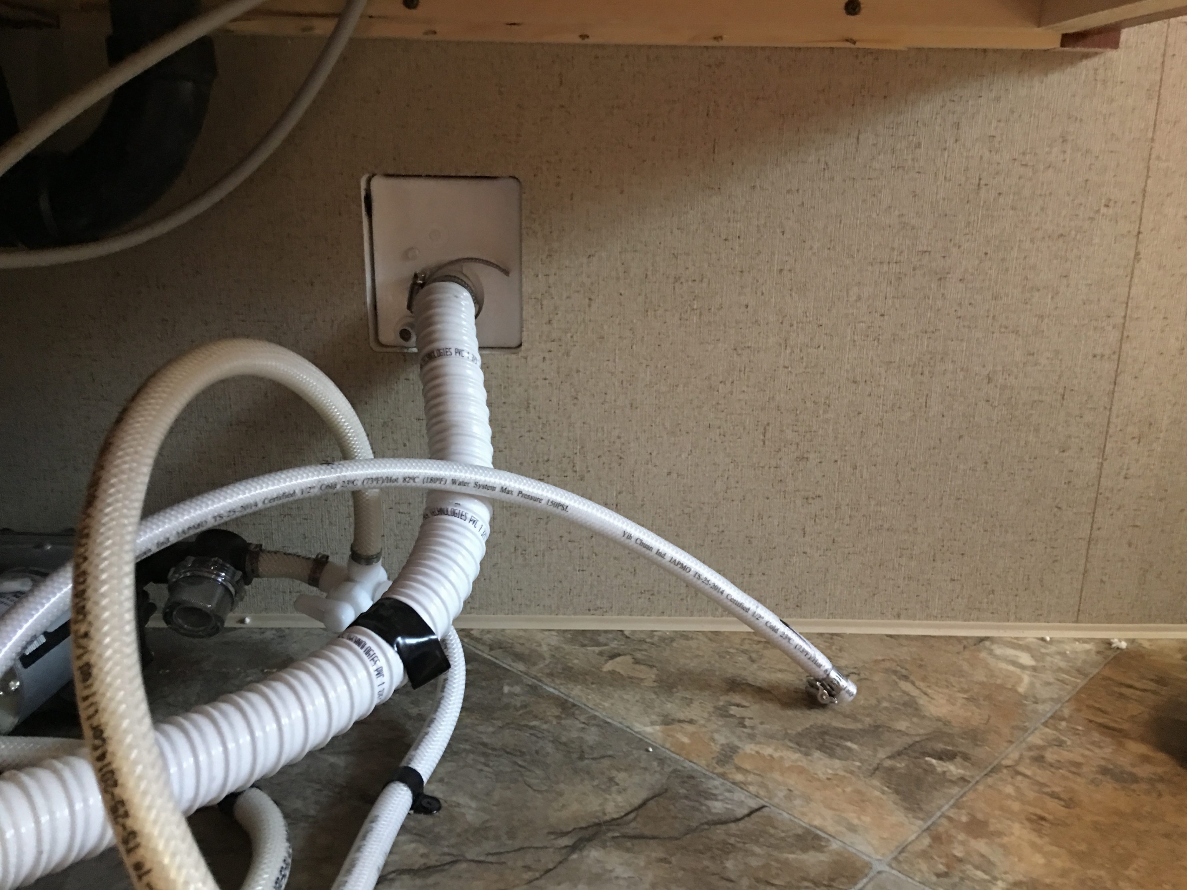 While the water tank was draining, I went back inside and heard air being sucked through a tube. I searched around under the sink and discovered the source of the sound. There was the tube coming out of the top of the fresh water tank with a clamp on the end that had never been tightened, and then I found the vent in the wall where that tube was supposed to be clamped. Not only had the water pump in our new trailer failed to keep the water tank from filling from the city water connection, but no one had bothered to connect the overflow tube to the outside vent! We could have simply had a problem with the water pump, but now we had water under the floor and wet insulation, because the overflow tube was directed at the inside of the trailer!!
