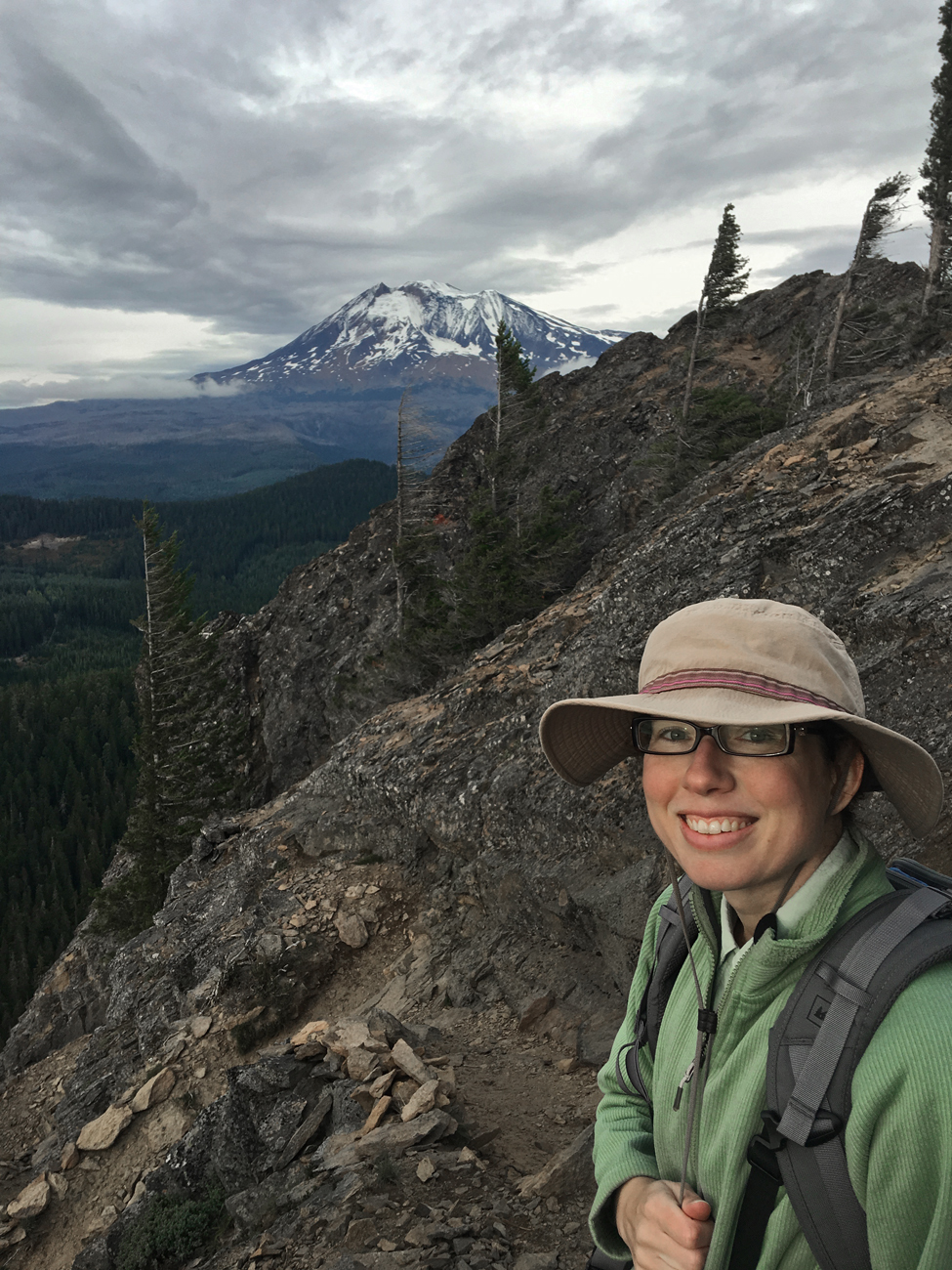 The forest around us was gorgeous, filled with every shade of green imaginable and dripping with lichens. Rain the day before had freshened the forest, and the firs were releasing their sweet scent that I can’t help but associate with Christmas. The final ascent was a series of narrow switchbacks on the rocky outcrop at the top of Sleeping Beauty. As we climbed up out of the dense forest, we were confronted with a cold, fierce wind, but the 360-degree views were spectacular. From the top of Sleeping Beauty, we could see the snow-capped volcanoes of the Cascades all around us. Mount Adams was in plain view just across the valley, and Mount Saint Helens was peaking over the top of another mountain to the northwest, and Mount Hood was in full view in the southern distance. We were quite pleased with the results of our random pick of trail for the day. The Gifford Pinchot National Forest has definitely made it onto my list of favorite forests!