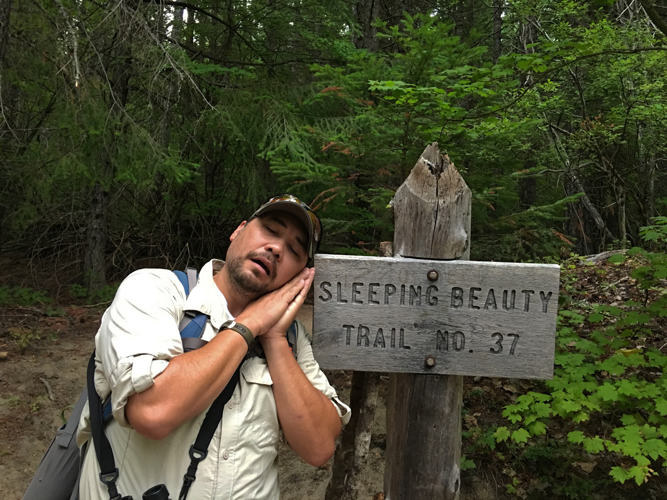 On Labor Day, after an hour-long drive on a narrow, gravel road, where we had to back up twice in areas that were only wide enough for one vehicle between the roadside shrubs, we nearly gave up but then finally found the Sleeping Beauty trailhead. We had no idea what feature on the landscape was given the name Sleeping Beauty. We simply picked a trail on the map and drove to it. The smaller road up to the trailhead was full of ruts and potholes, and I was glad we had a high clearance vehicle. We put on our backpacks and walked past the trailhead sign to discover that Sleeping Beauty was a mountain. The trail immediately became a series of steep switchbacks, so steep that my feet could barely make the angle required to stay on the trail in my minimalist shoes. The trail turned out to be 1.2 miles to the top with 1,400 feet of elevation gain in that short distance. In my current state of health, I don’t seem to get stronger with each hike, so it doesn’t get any easier for me. I just put one foot in front of the other, stop a lot to catch my breath, and appreciate the fact that I am still alive to experience all of this. The cool air of the Cascades in September certainly helped.