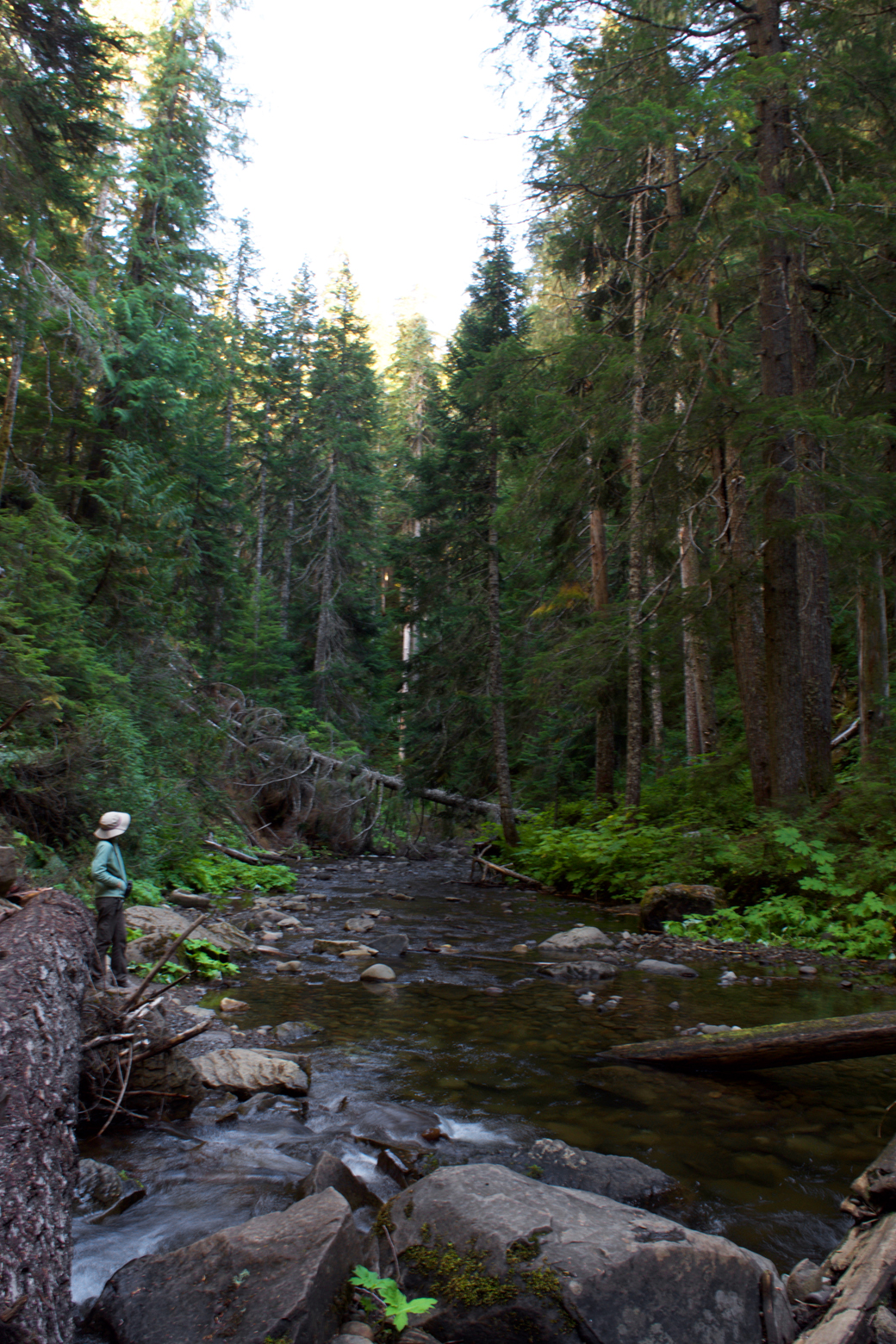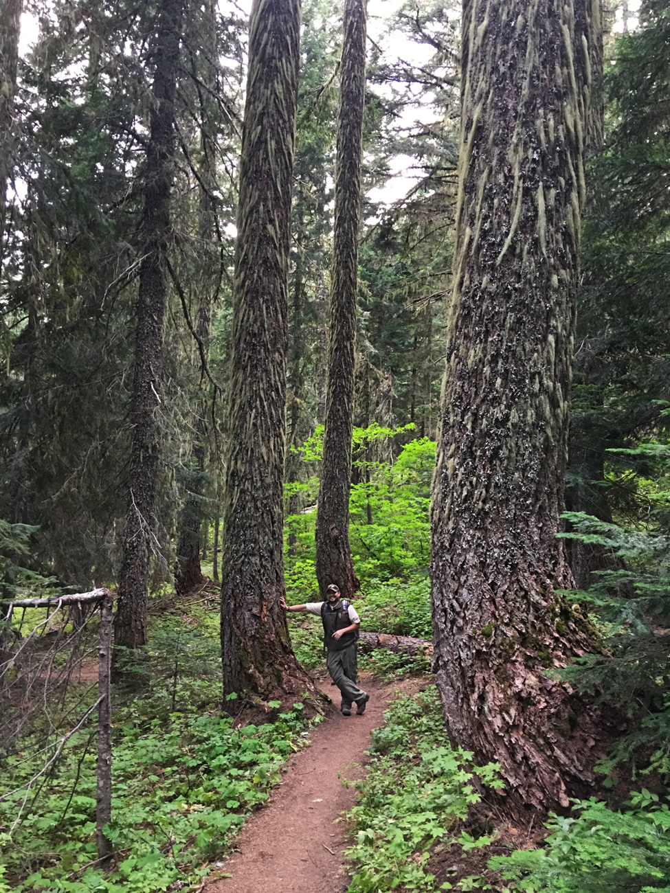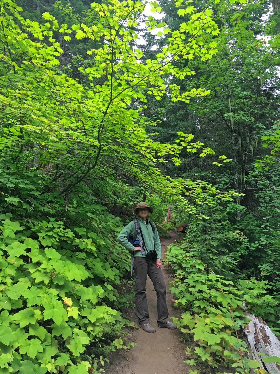 Then, about two-thirds of the way up, we spooked a flock of large and awkward birds that somehow flew through the forest without knocking themselves out on tree trunks! Luckily, they landed on branches of the firs immediately around us, and we saw through our binoculars that they were sooty grouse!
