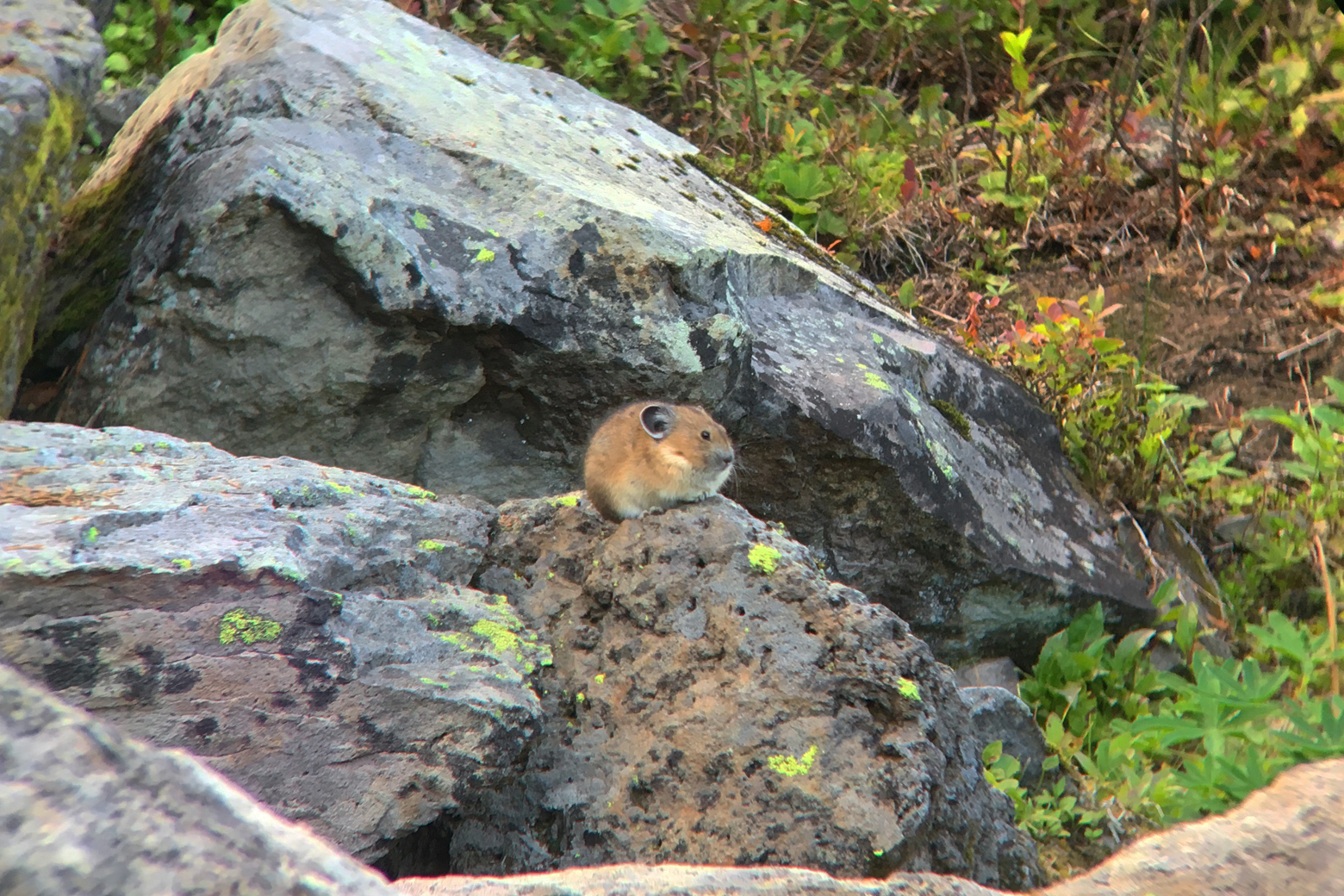 Near the top of the mountain as the trail got steeper, we heard the high-pitched squeaks of pikas. We came upon a rocky hillside, and we were startled when we realized there was a pika sitting on top of a boulder not far off the trail making all the noise. This was the closest we had ever gotten to a pika, and Michael got a pretty good photo through his binoculars.