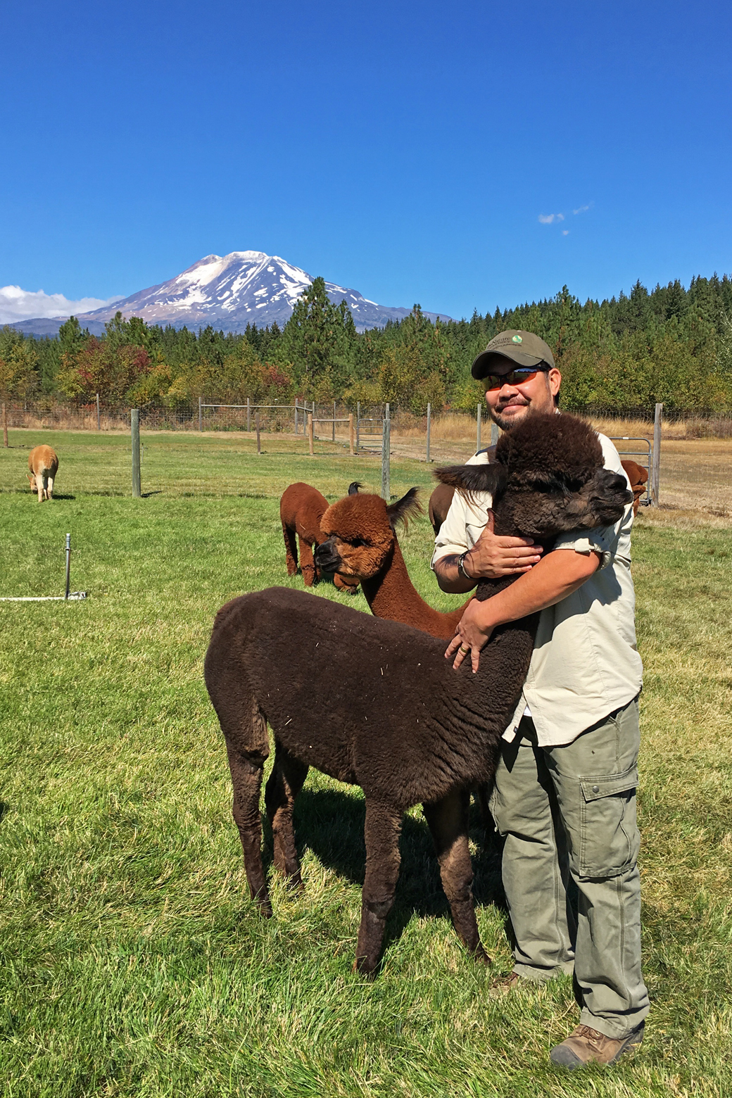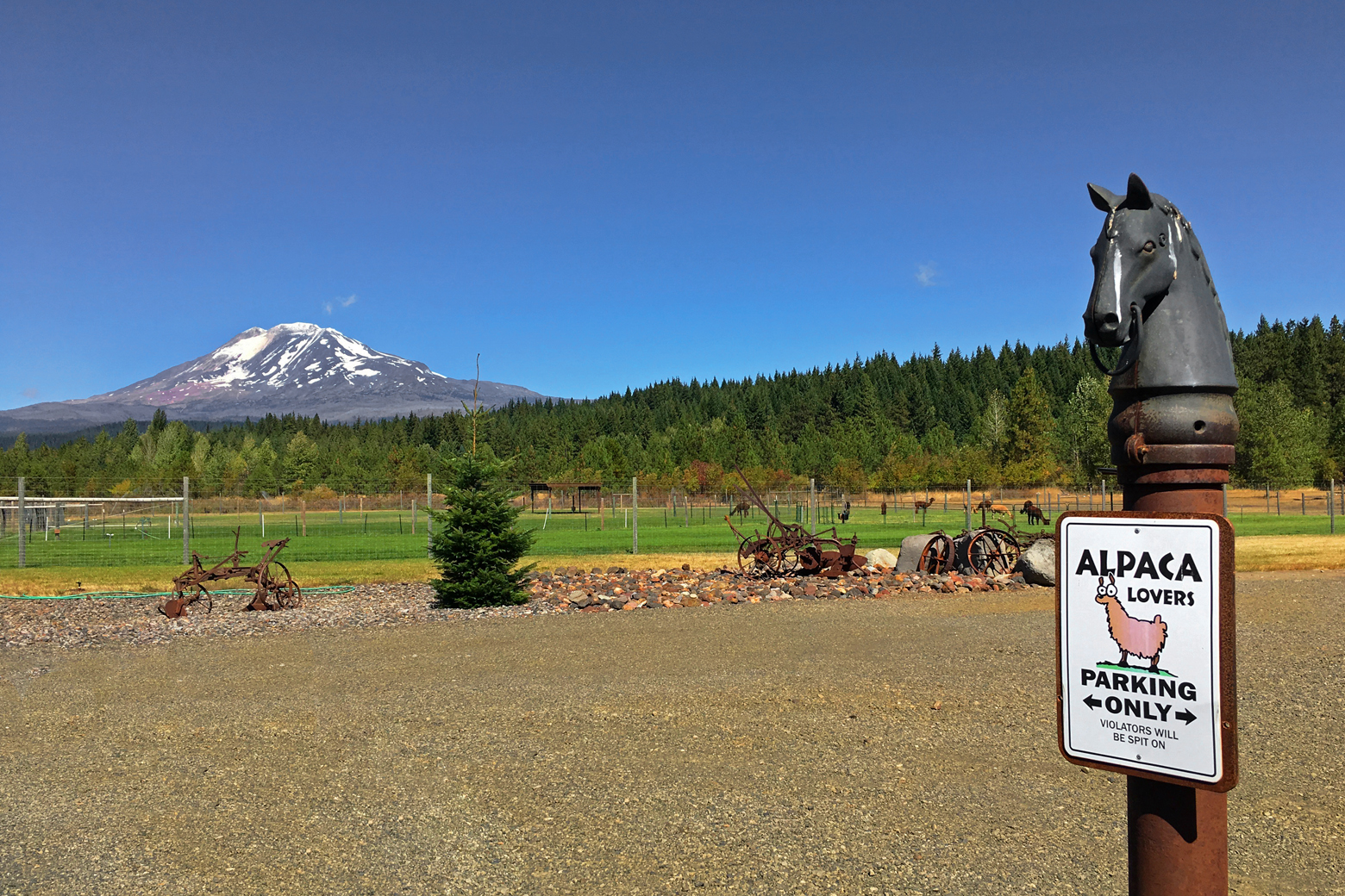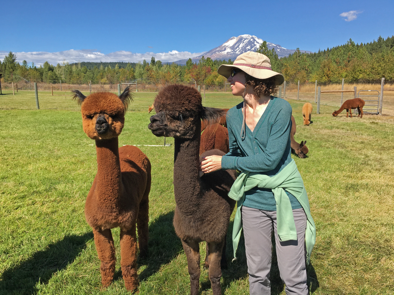 On our last day at Elk Meadows, we tried something a little different. Back in north-central Oregon, alpaca ranches started popping up on our route, and there was a local alpaca ranch on Mt. Adams Road in Trout Lake. We couldn’t help but be curious about the alpaca, and many of the ranches offered tours, so we took a tour of Meadowrock Alpacas Farm. The alpaca ranch is owned by a retired couple: Jim and Barbara. The idea and passion for breeding and raising alpacas originated with Barbara, and she studied the subject extensively before purchasing the property and designing and building the barn. Jim gave us a tour and taught us all sorts of interesting facts about the alpaca. Their fur is incredibly thick and soft, and they have long, glossy eyelashes and fur around their ears. Alpacas are also very neat: they use a communal latrine to do their business! We, and our friends Michael and Stephanie Tiffany, who were visiting from Ventura, were surprised by how much we liked these creatures. I can see why alpaca ranches are popping up on the landscape. We later enjoyed chatting with Barbara in their shop, and I purchased an alpaca hat to keep me warm on our travels through the winter.
