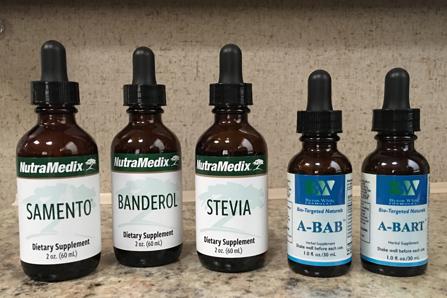 My herbal cocktail would consist of Samento, Banderol, and Stevia by Nutramedix for Lyme, A-Bab for Babesia, and A-Bart for Bartonella, both produced by Byron White Formulas. I was told to work my way up to a full dose slowly, increasing by one drop of the herbs each day. My full dose consists of 30 drops of each of the Lyme herbs twice per day, and 10 drops each of the herbs for the co-infections, also twice per day. The total monthly cost of this protocol: approximately $300. That brings my monthly herb and supplement bill to $600!