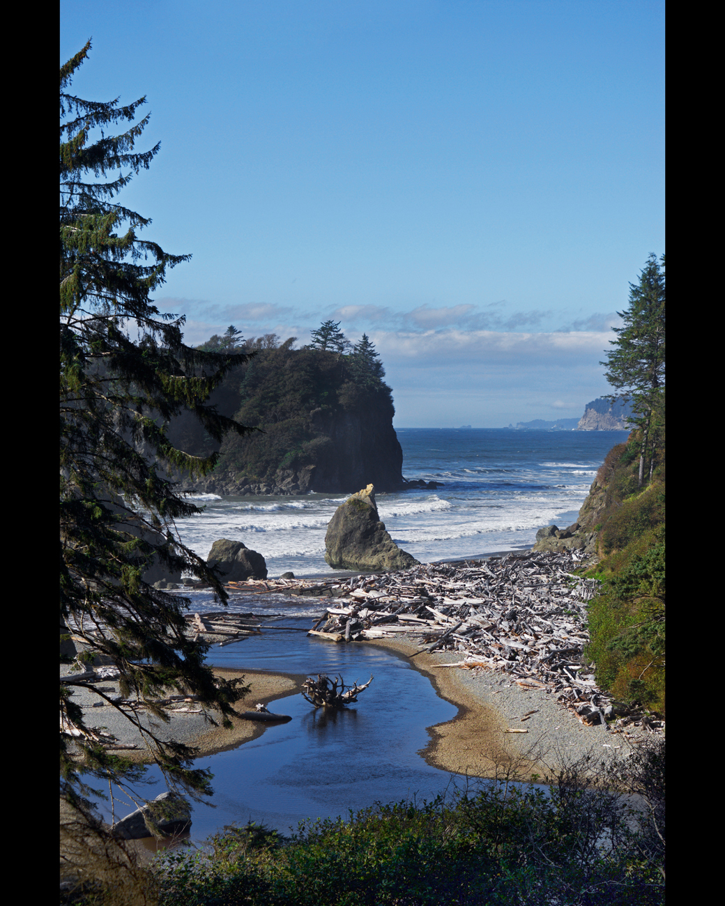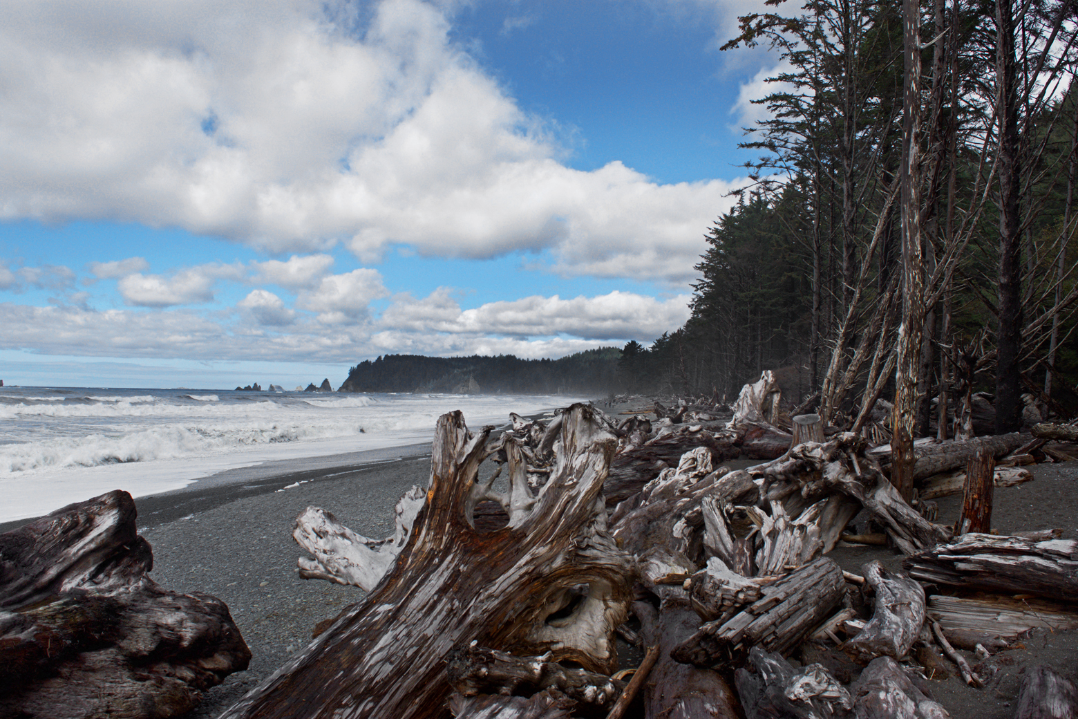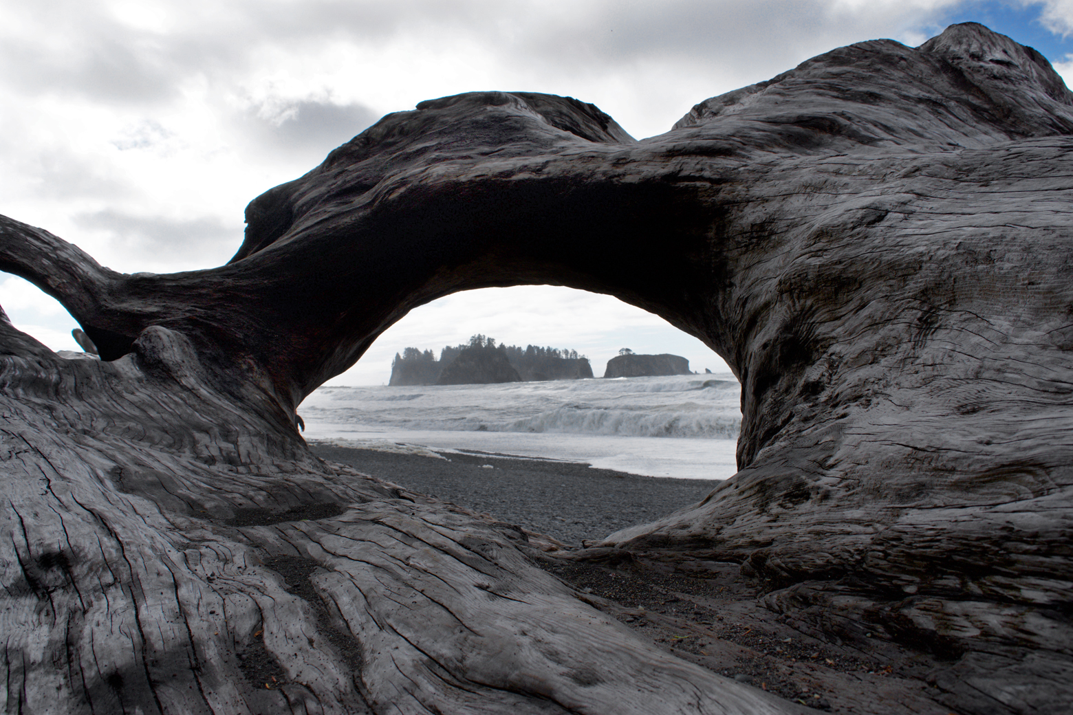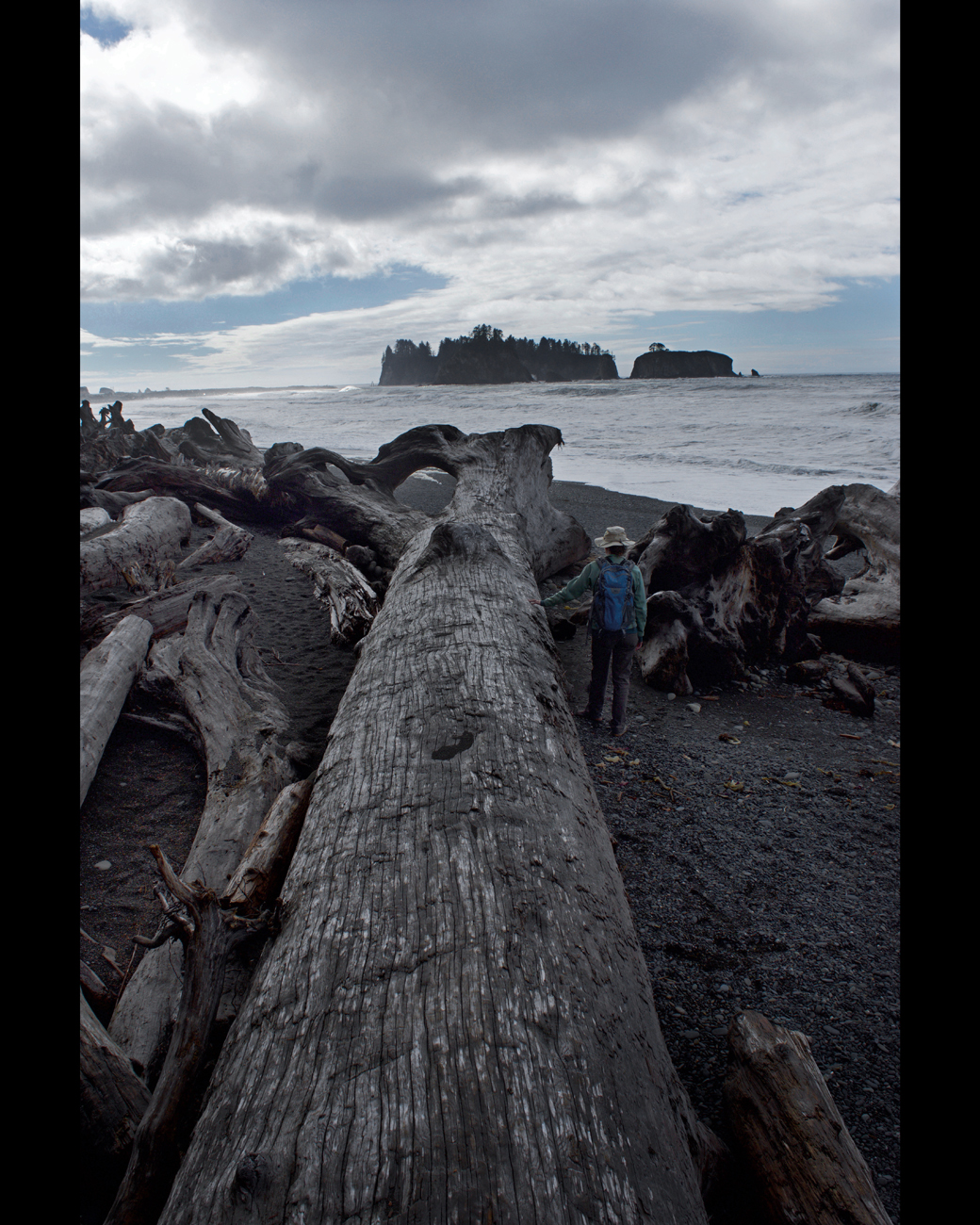 From our home base at Riverview RV Park in Forks, Rialto Beach was a short drive down Mora Road along the Quillayute River. We made the drive on our first afternoon in Forks after setting up camp. We arrived at Rialto Beach, got out of the truck, and were blasted by the wind and cold coastal air. We bundled up and headed out to the sand. Wow! The coast up here in Washington, and especially at Rialto Beach, is jaw-dropping, stunningly beautiful! This is one of those places where you really feel humbled by nature. The winds are blowing, and the waves are rough and choppy, pounding against rocks and shore. The driftwood piled on the beach is from massive old-growth trees, and it dwarfs us as we walk through it towards the water. The colorful pebbles below our feet that make up the beach are smooth from years of being pounded by water. The sea stacks (rock outcrops in the sea) stand tall just off the coast. I stood in awe at this stunning example of the beauty and power of nature. I felt small and insignificant in this grand scenery, and that was a good feeling.