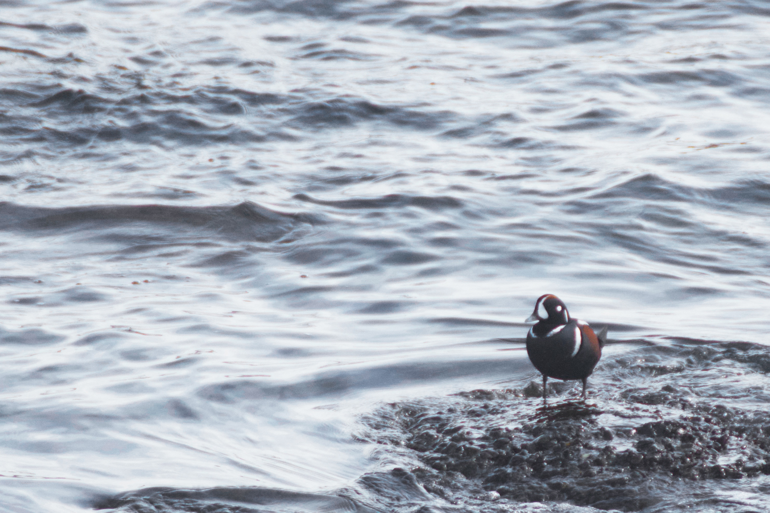 On our way to Neah Bay, we drove along the coast of the Strait of Juan de Fuca and stopped off at viewpoints, including one on Clallam Bay. There was a raft of birds floating just off the coast at Clallam Bay. Michael pulled off the road to let me scan the waters with my binoculars. It was gulls, gulls, gulls. I started to say that we could move on when I spotted a duck-shaped bird and decided I should take a closer look. “Harlequin duck! I’m not kidding!!” This was our very first sighting of this species. We hung out for a while and ended up watching and photographing a whole group of male and female Harlequin ducks.