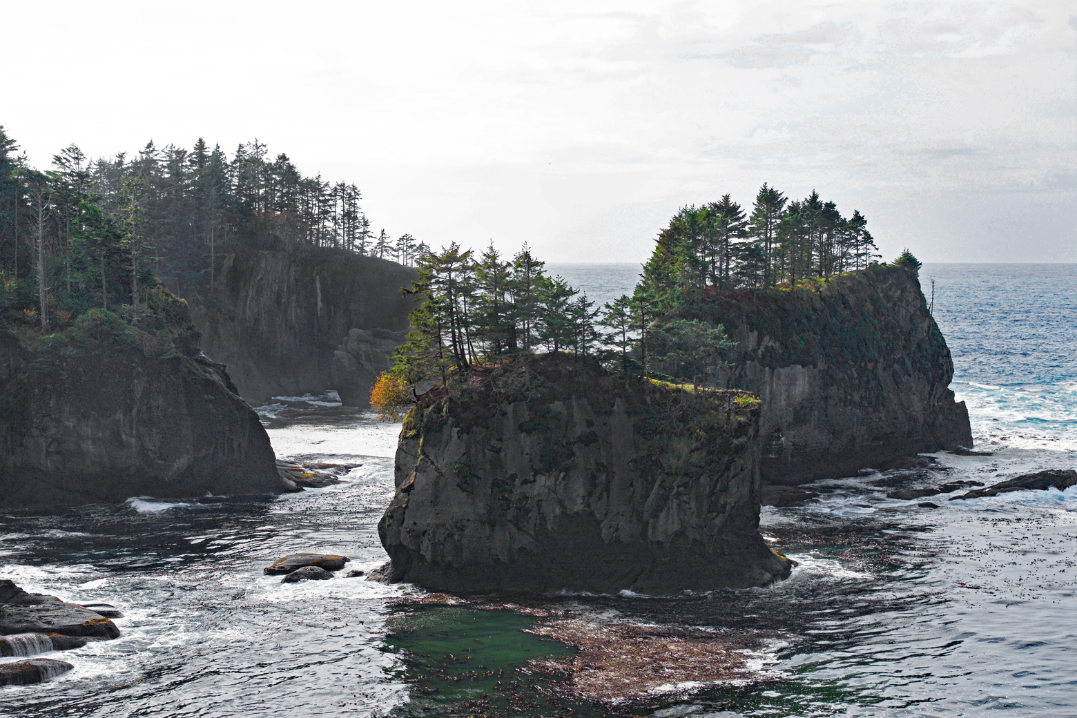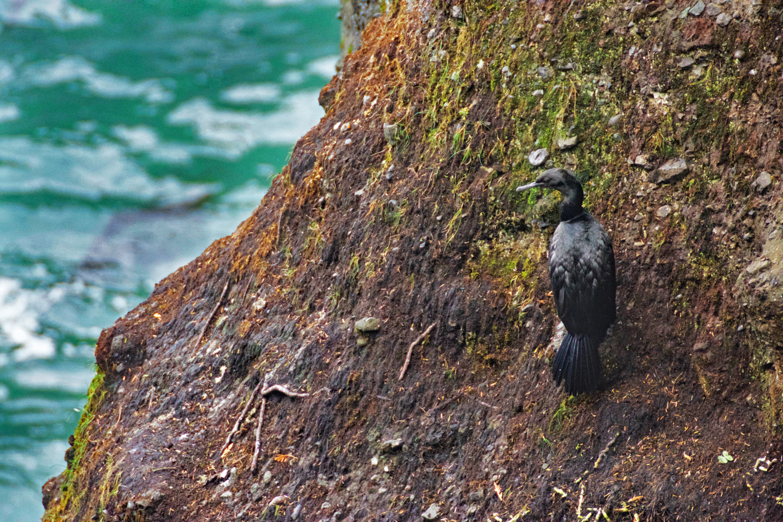 When we arrived in Neah Bay we picked up a permit from the Makah Museum to recreate on the reservation. We then headed out to the furthest point, Cape Flattery. The cape is a three-quarter-mile hike from the parking lot through the forest and on boardwalk. There are several observation decks on this rocky point from which to view sea stacks just off the coast and Tatoosh Island with its lighthouse in the distance. From the first deck we saw a bald eagle and lots of cormorants on one of the sea stacks. At the next deck there was a cave in the rocky coastline where some of the cormorants were taking refuge from the wind. This part of the coastline is, once again, absolutely stunning! The views of the rocky cliffs and sea stacks with the aquamarine water churning below, forming foam and white caps, were simply breathtaking. From the last observation deck we watched cormorants, gulls, scoters, and a group of sea lions lying on a distant rock and playing in the water. Down below us was a large group of black oystercatchers on another rock outcrop from the peninsula.