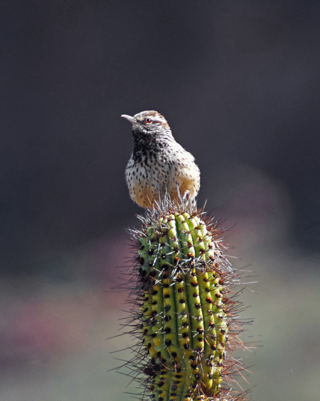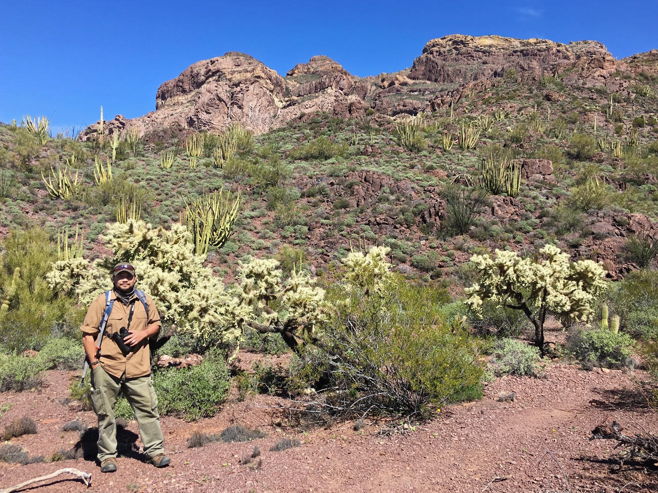 After lunch, we descended into Estes Canyon to complete the loop. Estes Canyon was densely vegetated with bright green palo verde, saguaro and organ pipe cactus, mesquite, and tree-sized, fruiting “jumping cholla” cacti. There was a lot more wildlife activity in the canyon. We saw black-tailed gnatcatchers, curve-billed thrashers, Gila woodpeckers, phainopeplas, and a desert cottontail. The views of the canyon walls beyond the dense desert vegetation were spectacular. We walked back out to Ajo Mountain Drive along the canyon floor, completing the four-mile hike with a total of 1,103 feet of elevation gain.