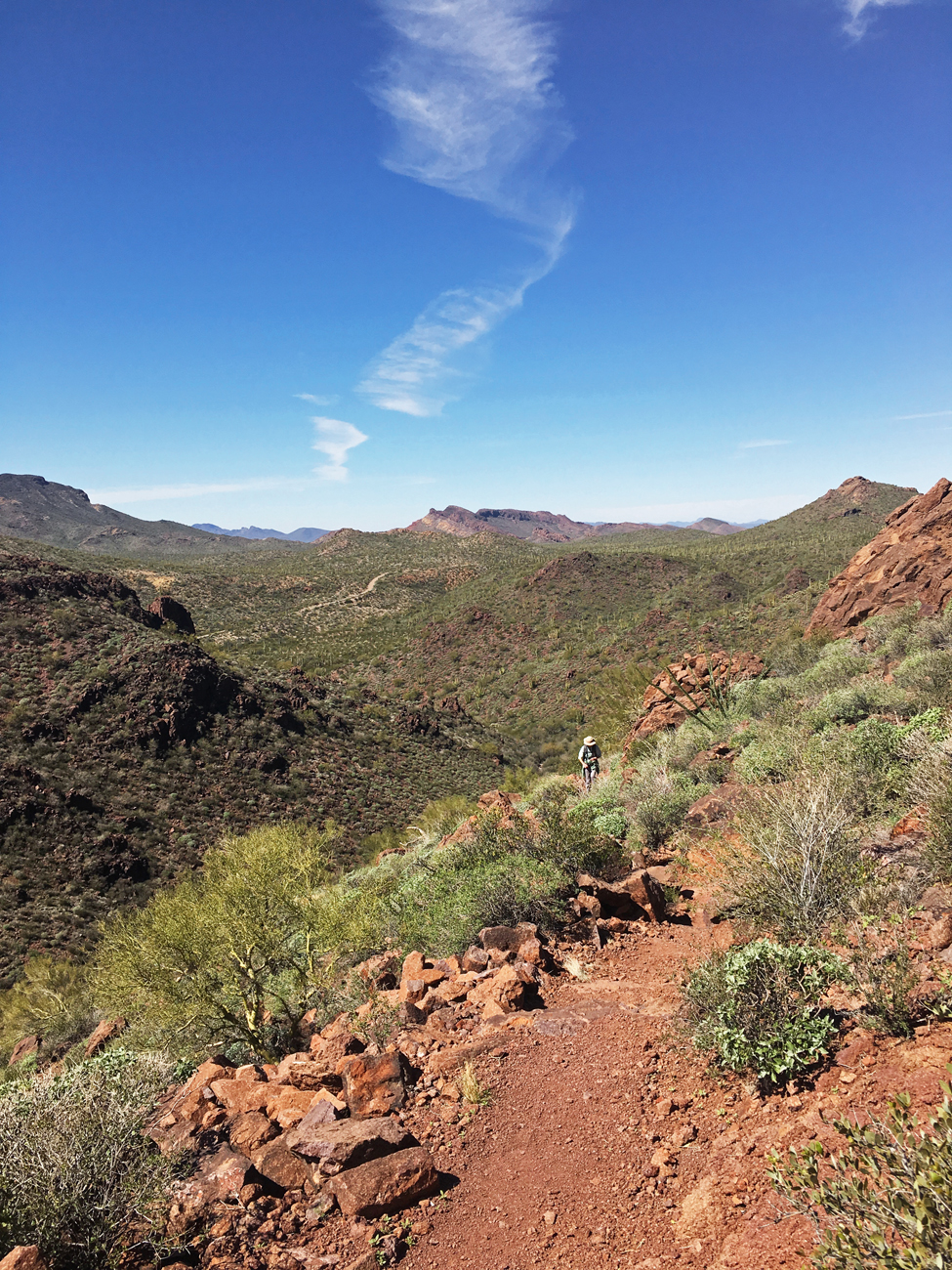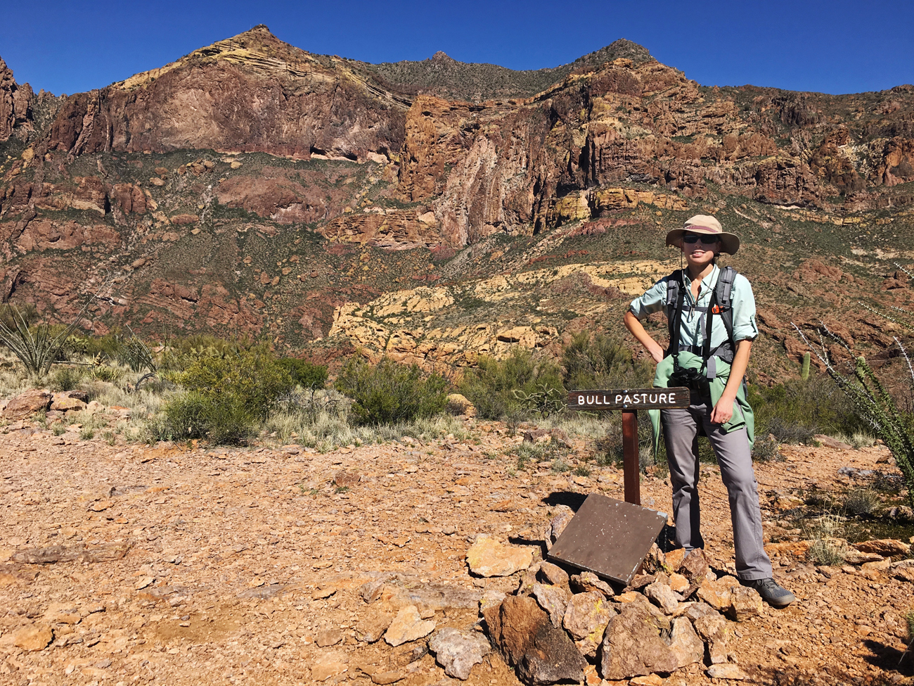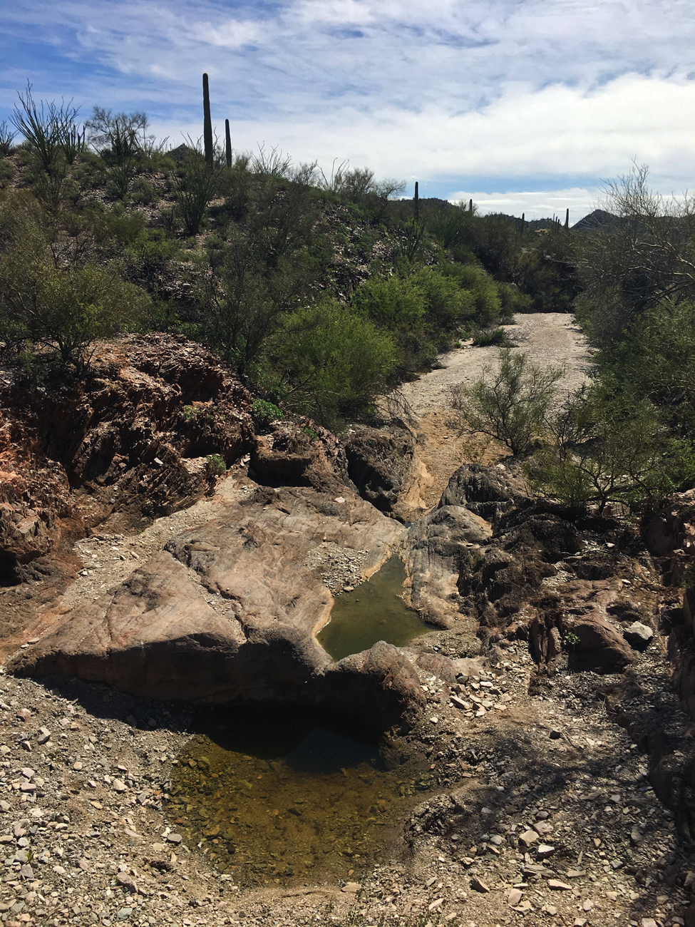 The next day we started off on an easy, level hike through the open desert out to “Red Tanks Tinaja,” a natural rock basin in a desert wash that holds water, which is so precious in the desert. The “tinaja,” Spanish for “jar,” was not an impressive destination. Sure, it was standing water in the dry desert, but we were expecting something much larger.