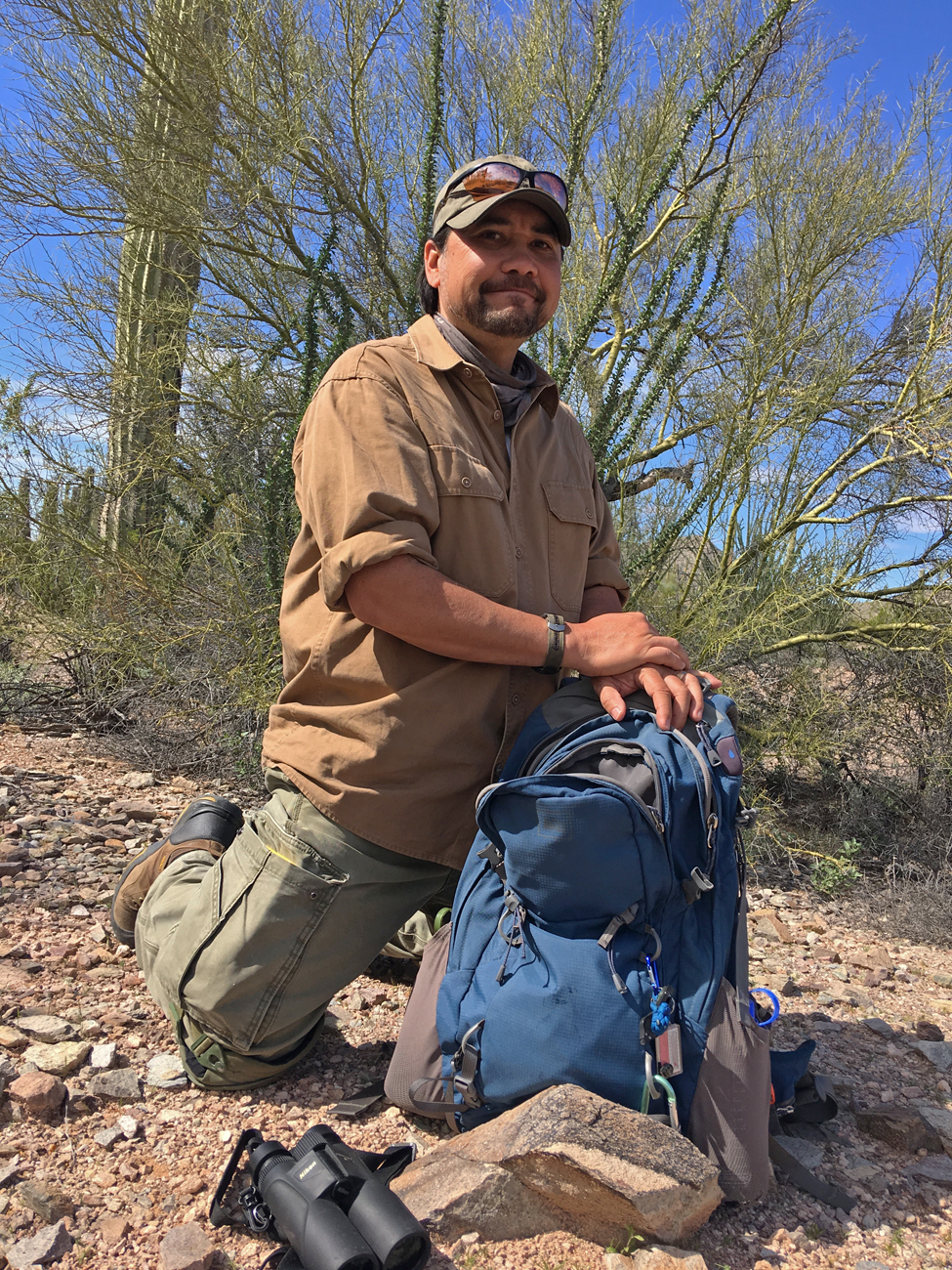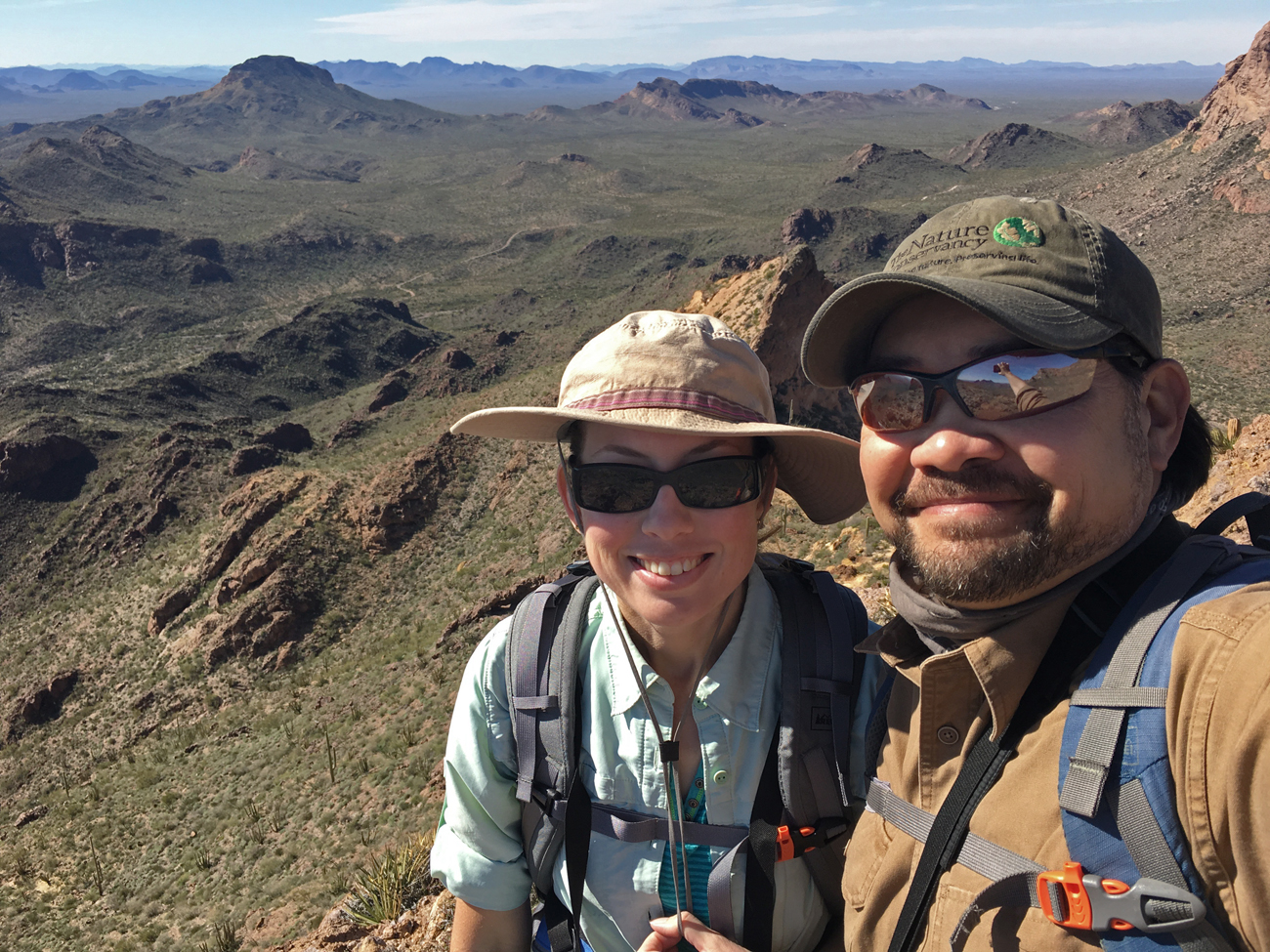 We hiked up the Bull Pasture trail, which is a slow and steady climb up to a small pasture in a mountain saddle. From there, we found a trail up to the top of the nearest peak and ate lunch. This is the hike that made us appreciate the remoteness of this monument. Aside from some farmland along a road in Mexico and the monument roads, there was no development within our 360-degree view from the peak. This trail also provides the opportunity to hike up onto one of the “sky islands” (mountains that rise sharply from the desert floor and support other habitats, like chaparral and forest). The peak that we hiked was not as high as some of the “sky islands” around Tucson, but we did notice changes in the vegetation, from cacti down below to chaparral, juniper, and agave at the top.