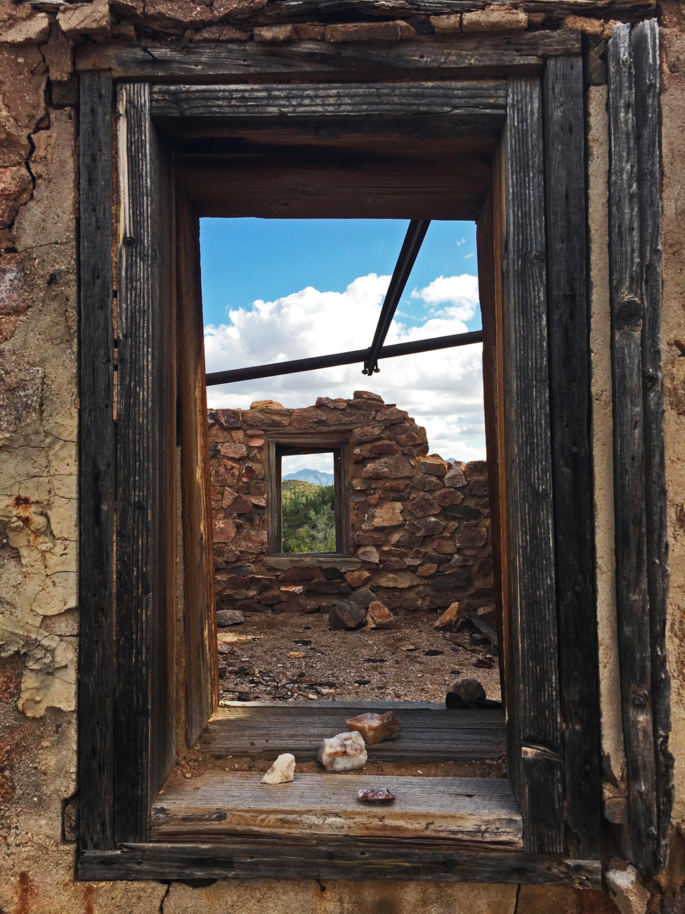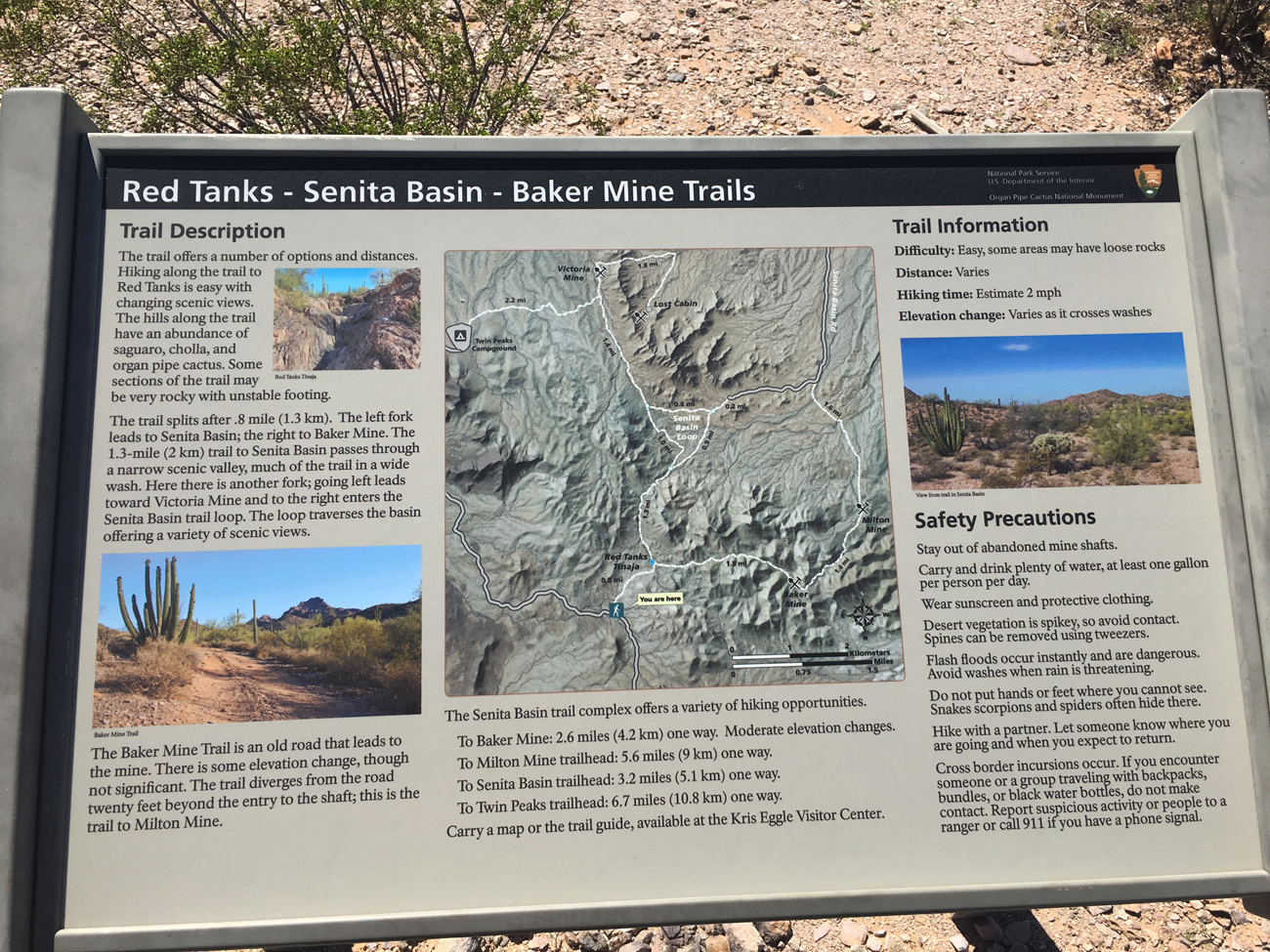Clearly we were encouraged by all the other hikers to make Victoria Mine our destination. We hiked up over hills and down into washes until we made it to the fenced off hole in the ground and the remnants of an old structure with a rusty old bath tub leaning up against the wall inside. There was a sign stating that the mine was now protected, because lesser long-nosed bats, which pollinate the saguaro and organ pipe cacti, roost there (read more about lesser long-nosed bats). From the vantage point of the mine, we could see the fence along the Mexican border and a group of homes on the other side.