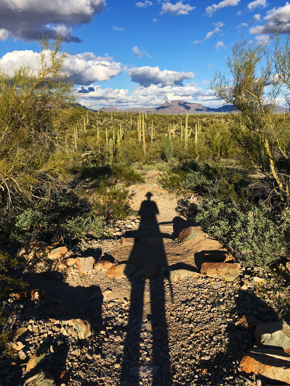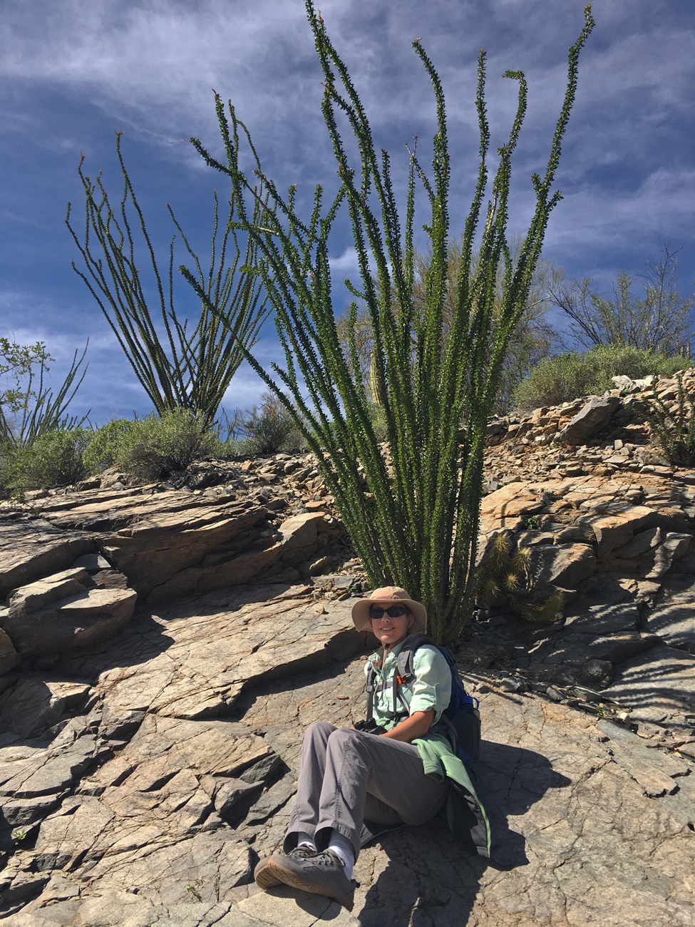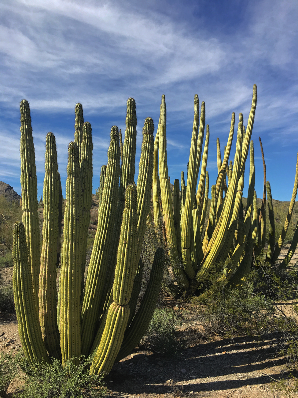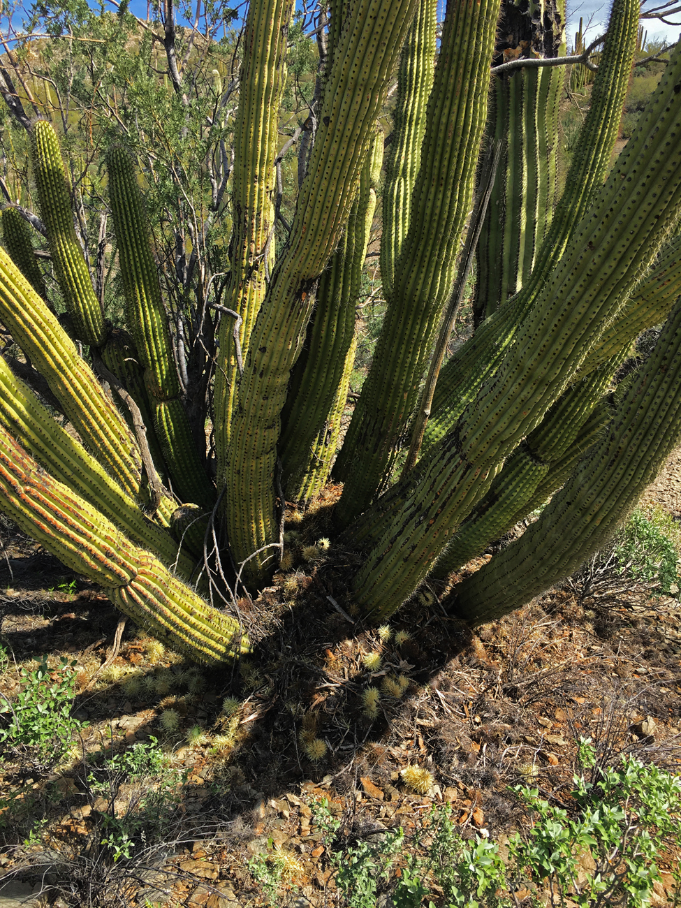 We stopped for lunch in the shade of some palo verde and discussed how tired we both were, considering our hike in the Ajo Mountains the day before. After that hike, I had attempted to convince Michael that we needed a day of recovery. With my chronic health issues recovery is slower, and it’s important that I give myself time to recover. However, the very next morning, after learning that a storm was coming the following day, I convinced Michael that we should make the most of the good weather and see more of the Monument. I suggested this easy, level walk through the desert, but here we were at one of the corners of the Senita Basin Loop, and we had not yet seen any senita cacti.