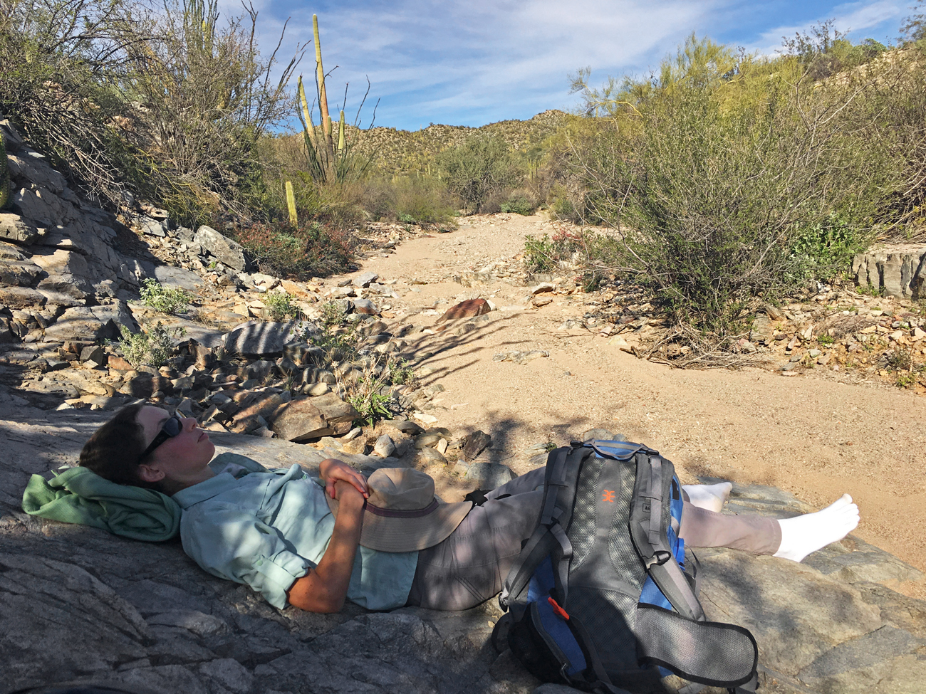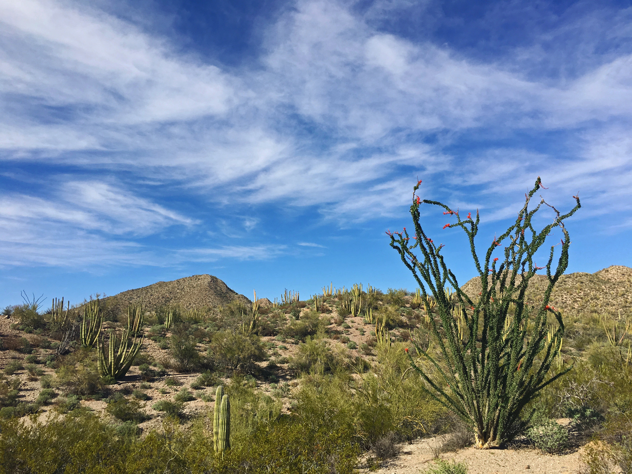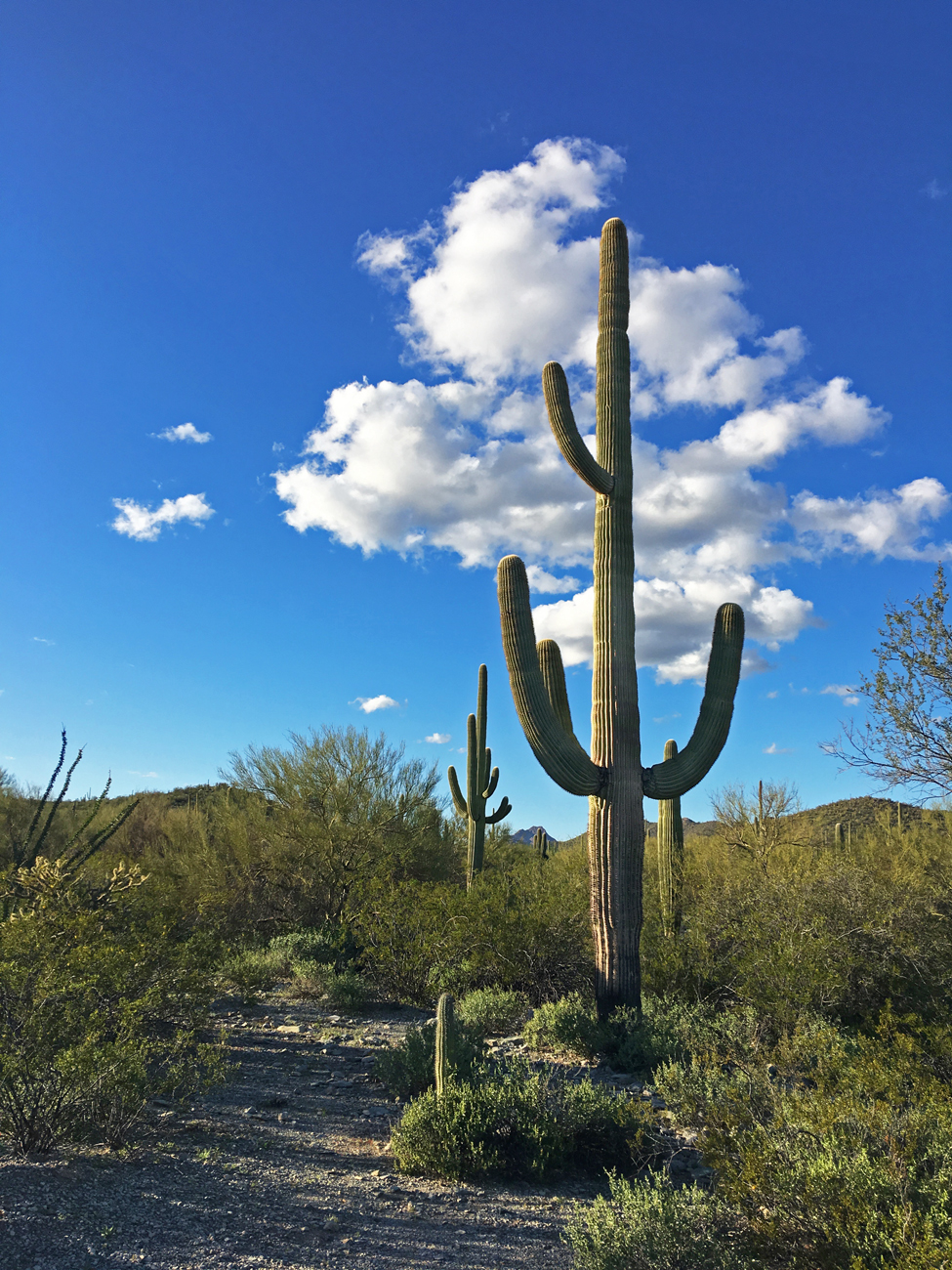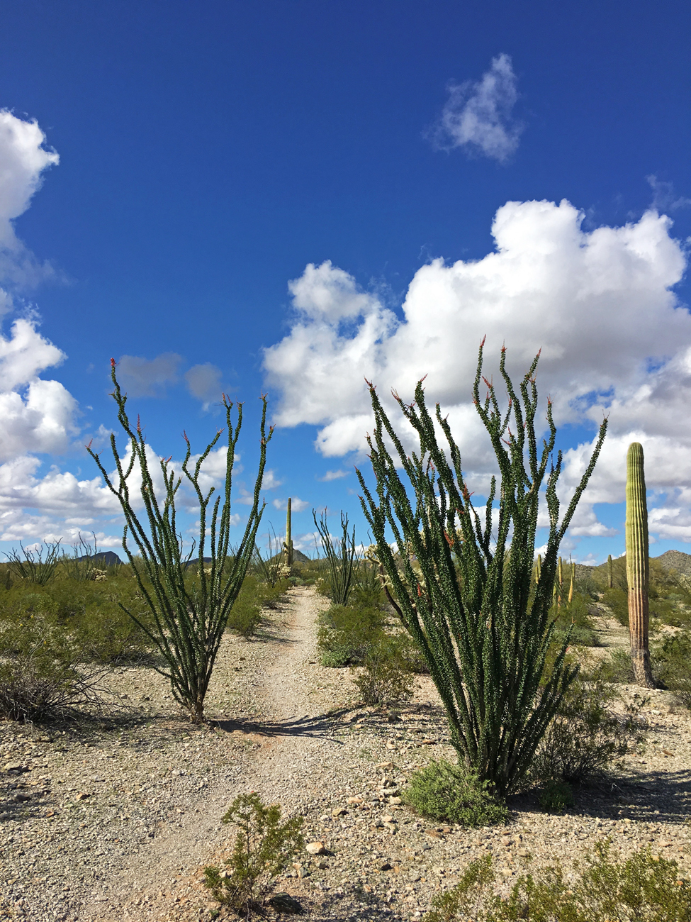 We stopped for lunch in the shade of some palo verde and discussed how tired we both were, considering our hike in the Ajo Mountains the day before. After that hike, I had attempted to convince Michael that we needed a day of recovery. With my chronic health issues recovery is slower, and it’s important that I give myself time to recover. However, the very next morning, after learning that a storm was coming the following day, I convinced Michael that we should make the most of the good weather and see more of the Monument. I suggested this easy, level walk through the desert, but here we were at one of the corners of the Senita Basin Loop, and we had not yet seen any senita cacti.