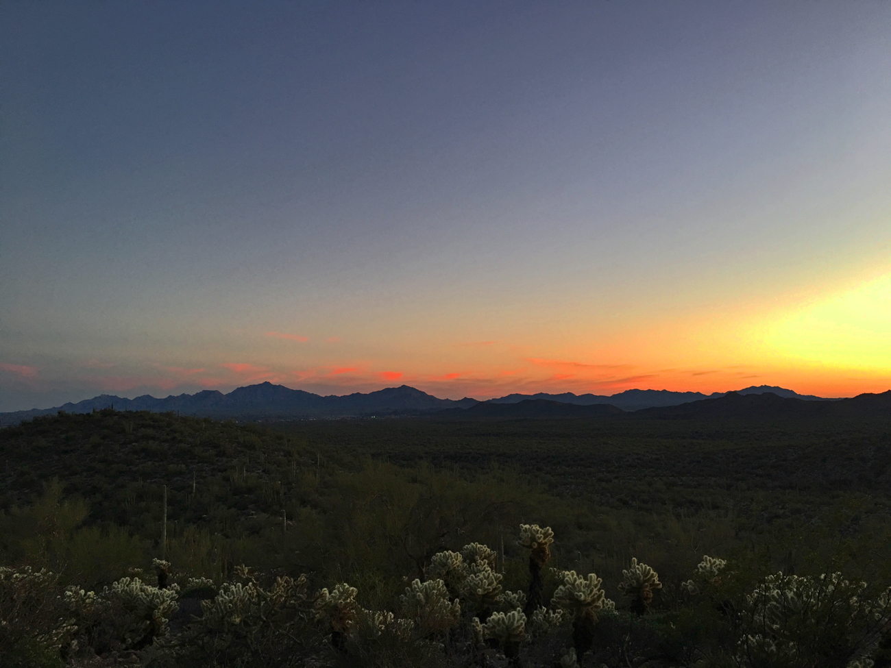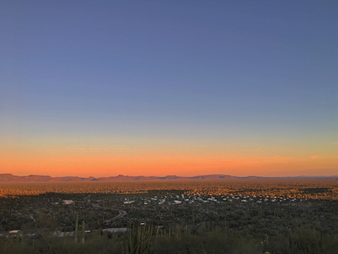 On our last evening, we drove over to the Desert View Trail and quickly hiked the switchbacks to the top of the hill to watch one last sunset over Organ Pipe Cactus National Monument. The Ajo Mountains lit up in pinks and reds, and after the orange globe disappeared, the silhouettes of the saguaro cacti felt like friends standing around us. We felt at home here.