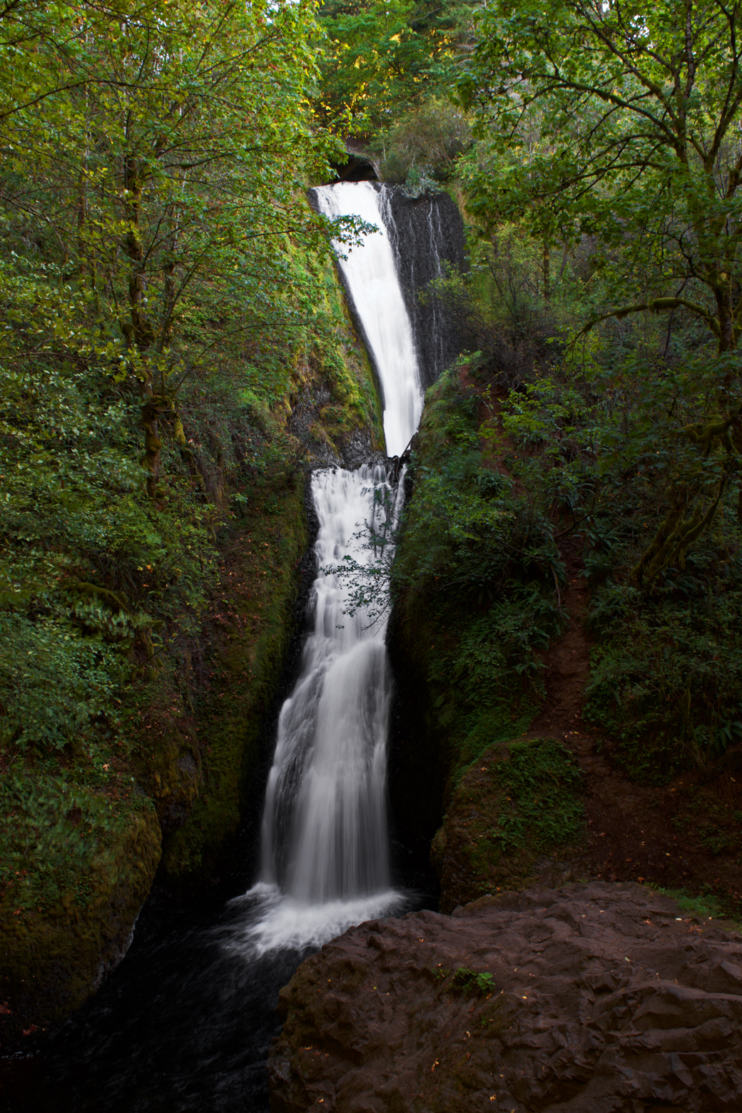 On our first afternoon, we headed east on the Historic Columbia River Highway from our RV park to check out the first few waterfalls of the Gorge. A 15-minute drive on this beautiful twisting highway with views of the Columbia River brought us to the trailhead for Bridal Veil Falls. The hike down to these falls is about one-third of a mile. A lovely bridge provides views of the creek framed by moss and fern-covered trees, and a short walk up the hill on the other side of the creek brings the double Bridal Veil Falls into view. After lingering on the viewing platform for a bit, we climbed down on the rocks below the platform to view the falls from the creek.