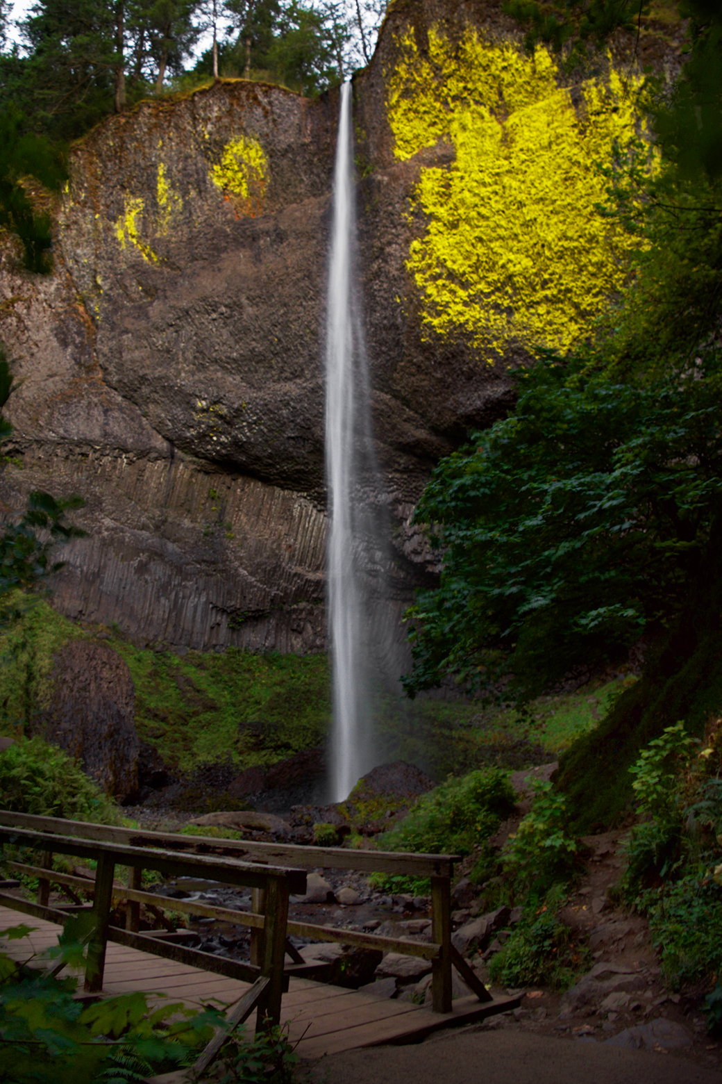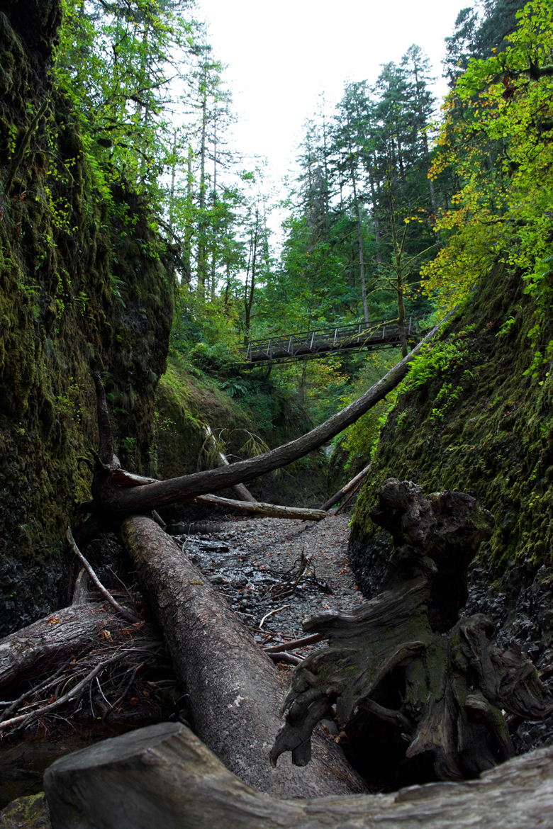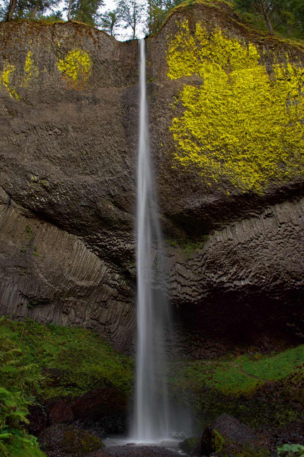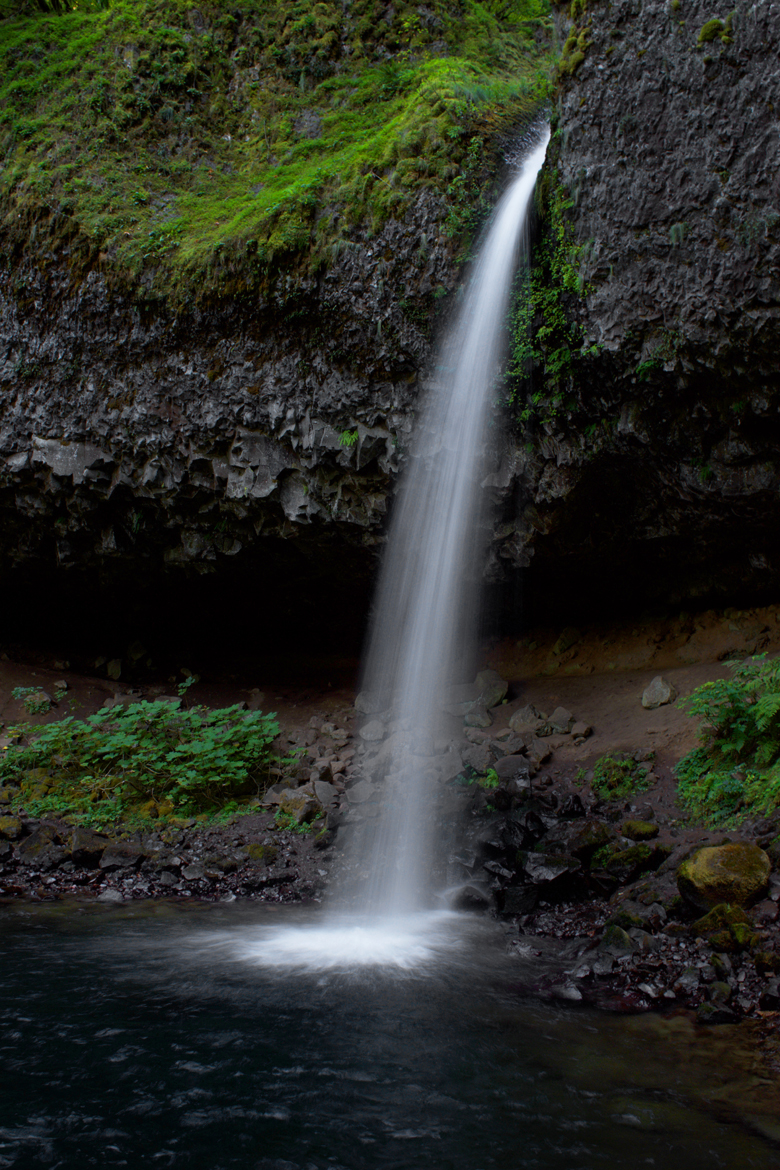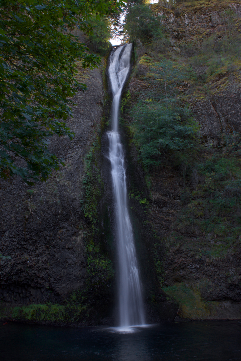 We made it to Latourell Falls just before sunset. These are the only falls we managed to see on our last Portland trip, and we arrived at nearly dusk the last time as well. This time, the falls were much more narrow, given the dry time of year, but these are still my favorite falls of the Gorge. The wall behind the falls is concave and composed of basalt in the shape of vertical columns, a distinctive rock formation. Bright yellow lichens grow on the upper levels of rock closest to the falls, and the water free-falls away from the wall and plunges into the pool far below the cliff’s edge…stunning!