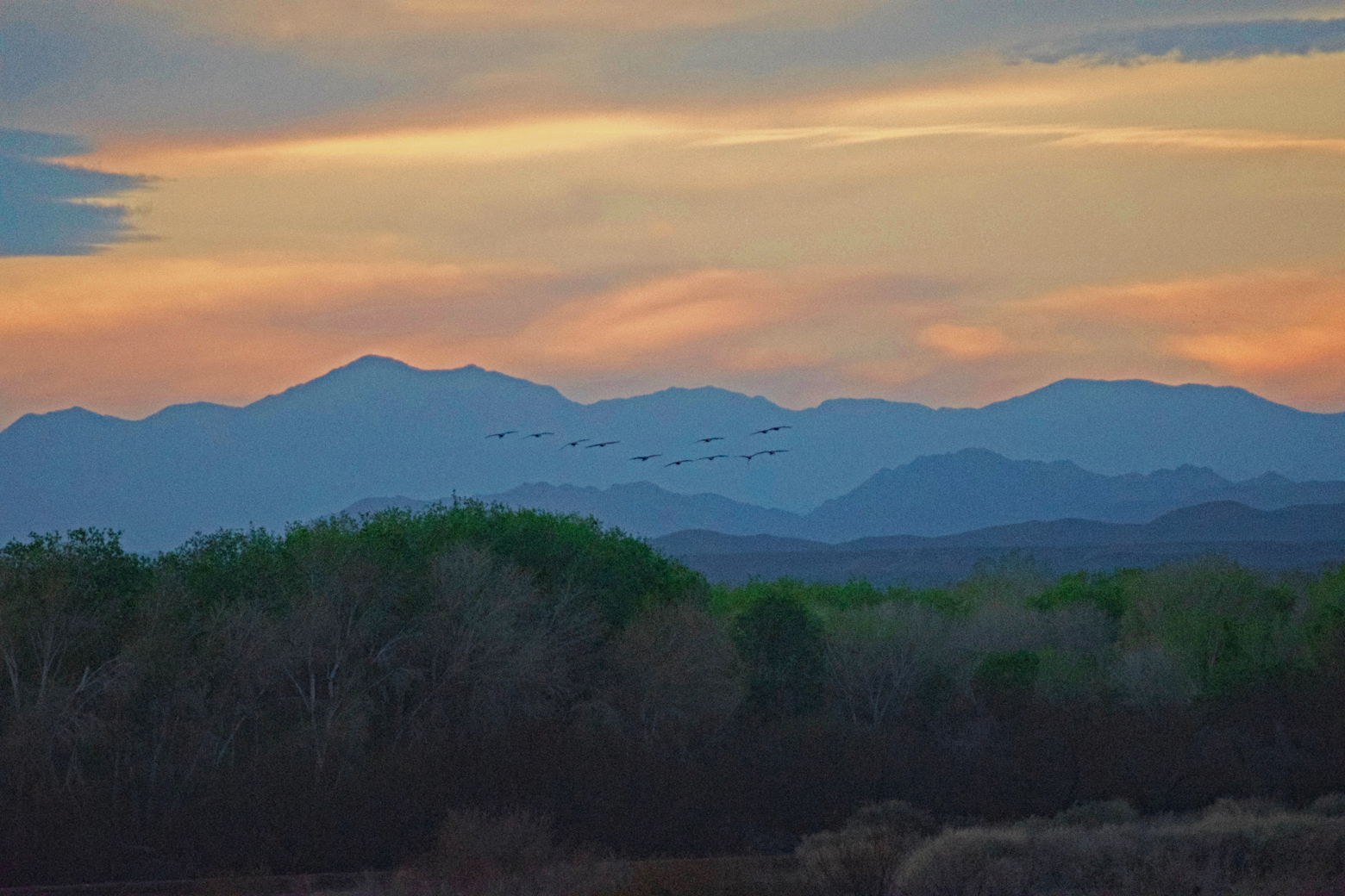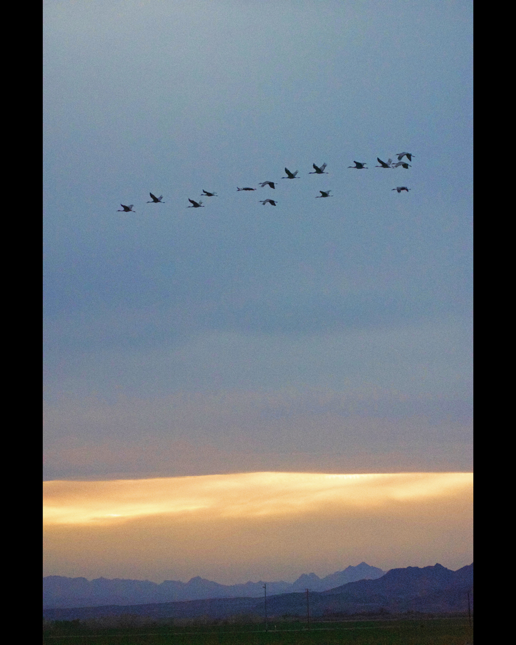 From our campsite near Cibola National Wildlife Refuge, we watched hundreds of sandhill cranes fly in to roost in the wetlands every evening as the sun was setting. Their calls tickled our ears and gave us goose bumps. At night we fell asleep to their intermittent calls rising up from the wetlands as well as the calls of snow geese at the refuge. Every now and then, we heard the chorus of a pack of coyotes, which to me, sounds like a crescendo of screaming, excited girls.