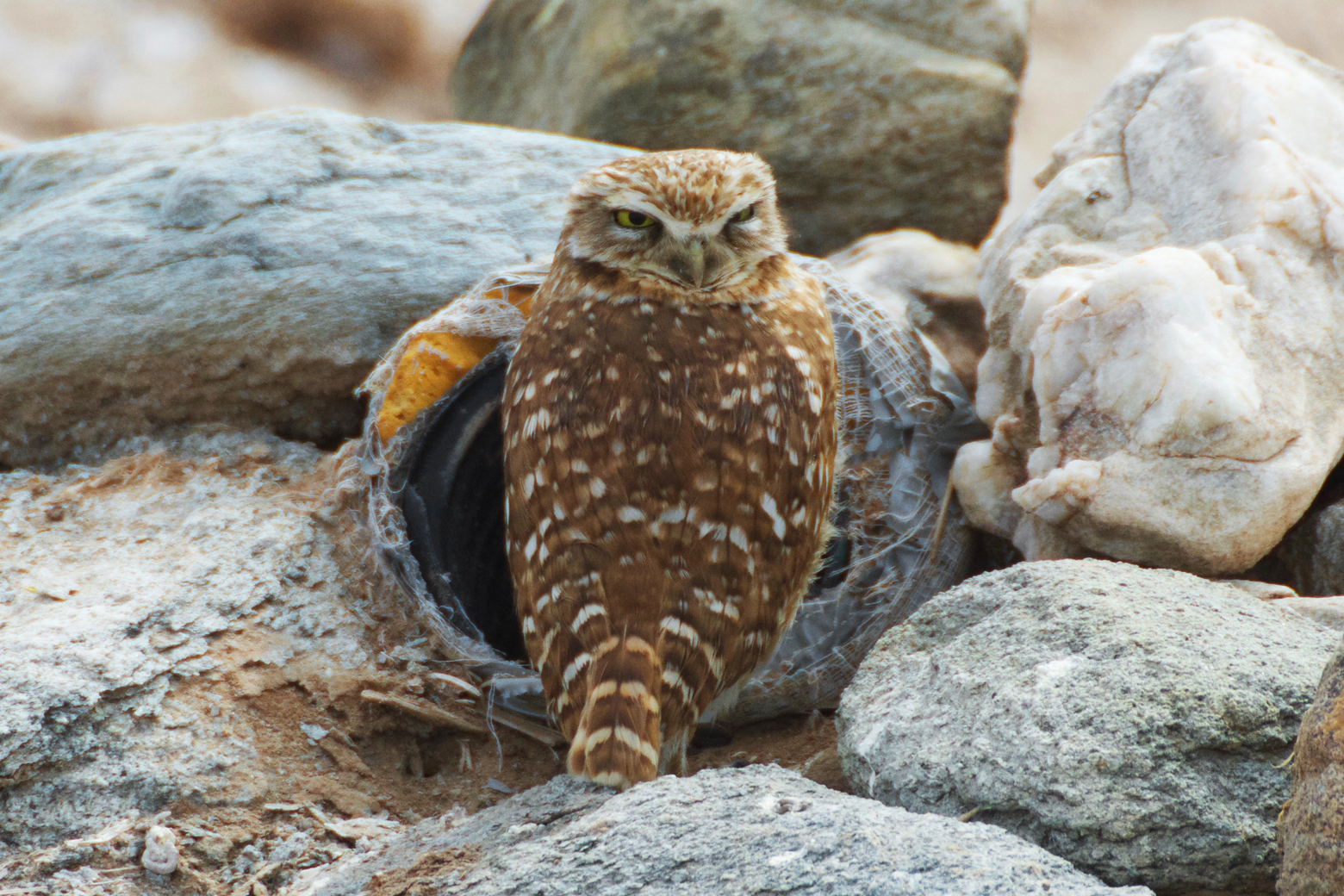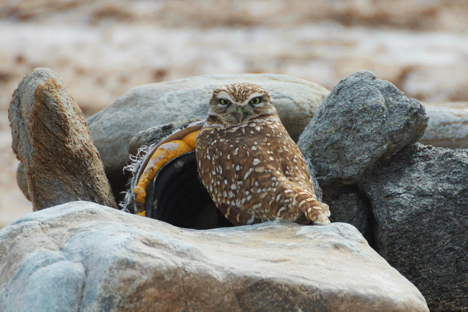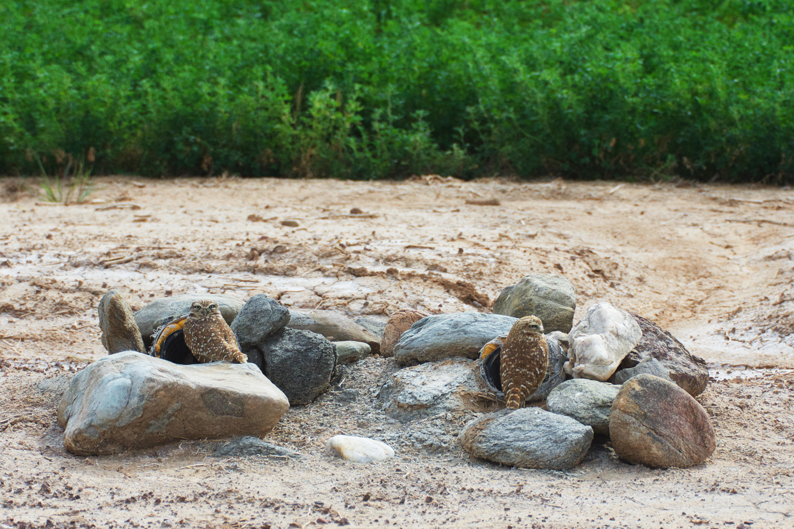 As we drove through the agricultural fields at the refuge, we noticed that the U.S. Fish and Wildlife Service had constructed burrows in the levees out of corrugated drainage pipes, presumably for burrowing owls. We arrived at one with two owls sitting immediately outside their burrow. Burrowing owls are just adorable. They sat with their backs toward us, but turned their heads all the way around to look at us. They were keeping a watchful eye. When one turned away from us, the head on the other one swiveled around to face us.