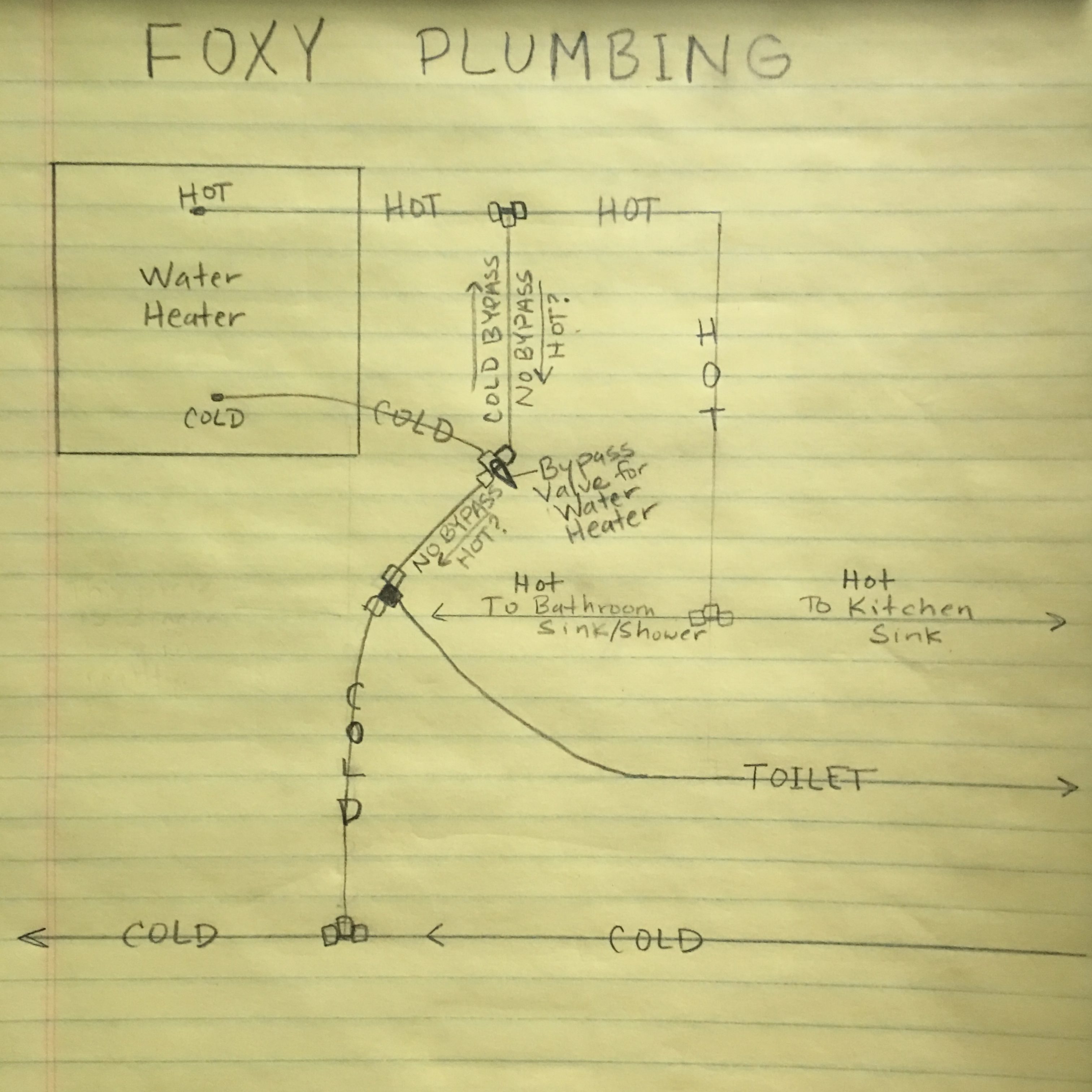 Although we solved the secondary problems that resulted from the plumbing problem, we have yet to solve the mystery behind the toilet. Why is this plumbing connection so tenuous? Or is there some additional pressure back there that other connections in the trailer do not experience? We inspected the plumbing around the water heater. In my diagram below, there is a bypass for the water heater. When the bypass is open to allow water to the heater, could hot water flow back through the hose and heat the water to the toilet? The connection to the toilet does seem a bit close to the water heater, but we will not know if this is unusual unless we hire someone who has seen hundreds of these. It may just be time to hire a professional.